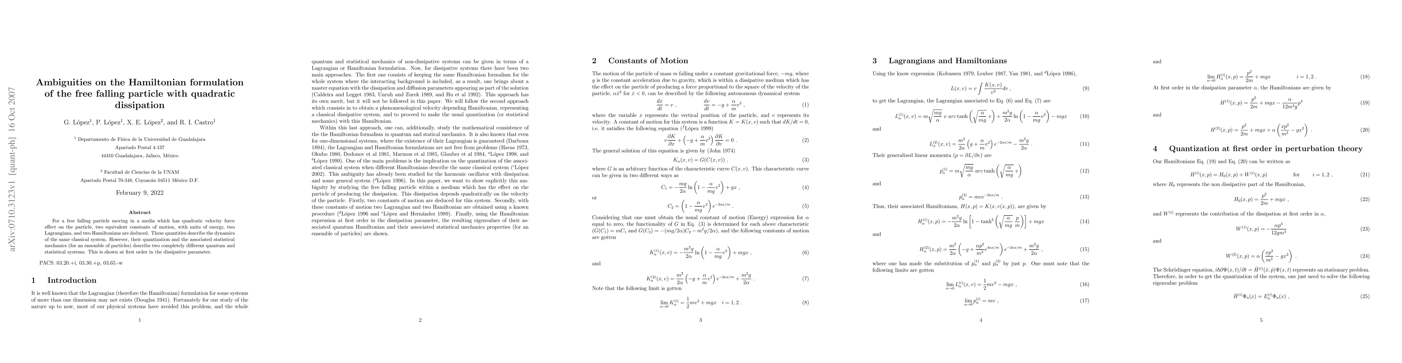 This paper explores the Hamiltonian formulation for a free-falling particle with quadratic dissipation, revealing two equivalent sets of constants of motion, Lagrangians, and Hamiltonians. Despite describing the same classical dynamics, their quantization leads to entirely different quantum and statistical systems.
