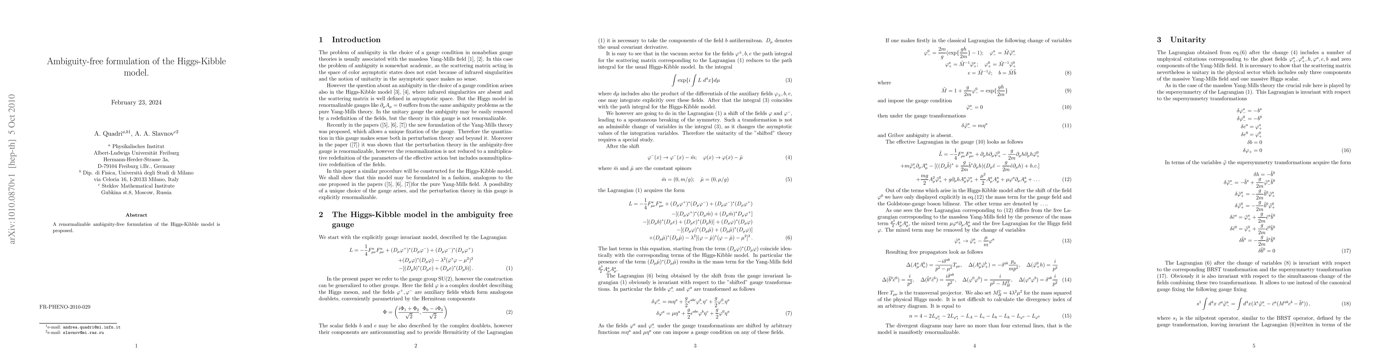 Summary: This paper introduces a renormalizable and ambiguity-free formulation of the Higgs-Kibble model, aiming to provide a clearer and more precise theoretical framework. The proposed approach seeks to eliminate ambiguities typically found in existing formulations.
