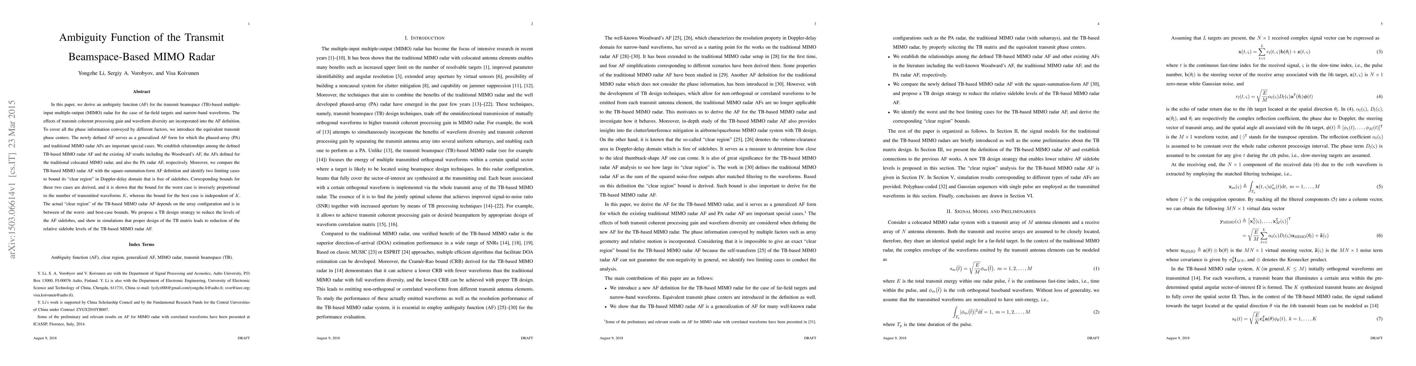 In this paper, we derive an ambiguity function (AF) for the transmit beamspace (TB)-based multipleinput multiple-output (MIMO) radar for the case of far-field targets and narrow-band waveforms. The effects of transmit coherent processing gain and waveform diversity are incorporated into the AF definition. To cover all the phase information conveyed by different factors, we introduce the equivalent transmit phase centers. The newly defined AF serves as a generalized AF form for which the phased-array (PA) and traditional MIMO radar AFs are important special cases. We establish relationships among the defined TB-based MIMO radar AF and the existing AF results including the Woodward's AF, the AFs defined for the traditional colocated MIMO radar, and also the PA radar AF, respectively. Moreover, we compare the TB-based MIMO radar AF with the square-summation-form AF definition and identify two limiting cases to bound its 'clear region' in Doppler-delay domain that is free of sidelobes. Corresponding bounds for these two cases are derived, and it is shown that the bound for the worst case is inversely proportional to the number of transmitted waveforms K, whereas the bound for the best case is independent of K. The actual 'clear region' of the TB-based MIMO radar AF depends on the array configuration and is in between of the worst- and best-case bounds. We propose a TB design strategy to reduce the levels of the AF sidelobes, and show in simulations that proper design of the TB matrix leads to reduction of the relative sidelobe levels of the TB-based MIMO radar AF.