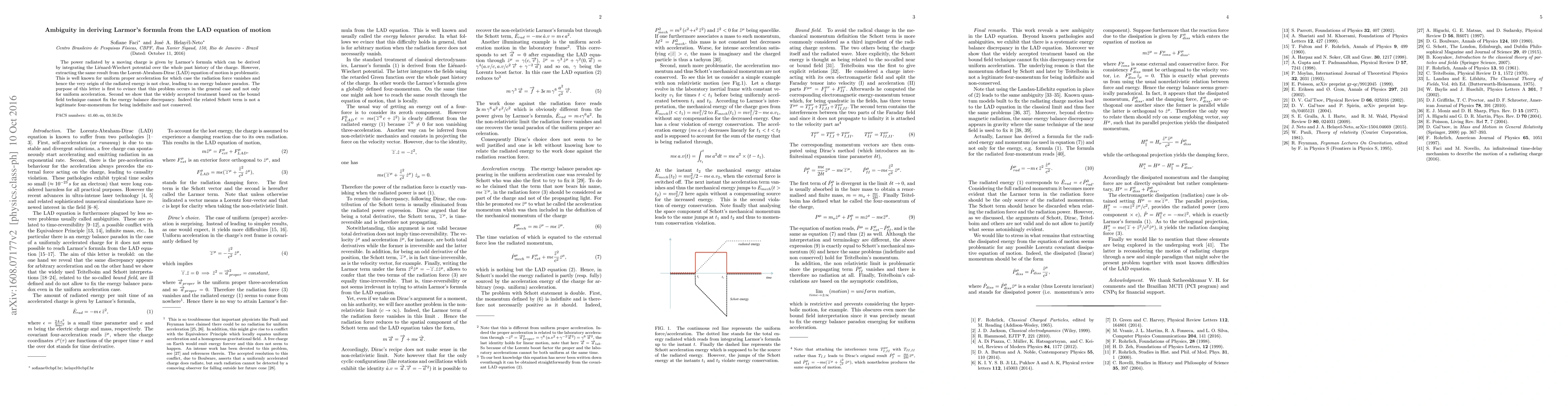 A study reveals that deriving Larmor's formula from the Lorentz-Abraham-Dirac (LAD) equation of motion is challenging due to an energy balance paradox, which affects non-uniform acceleration cases as well.