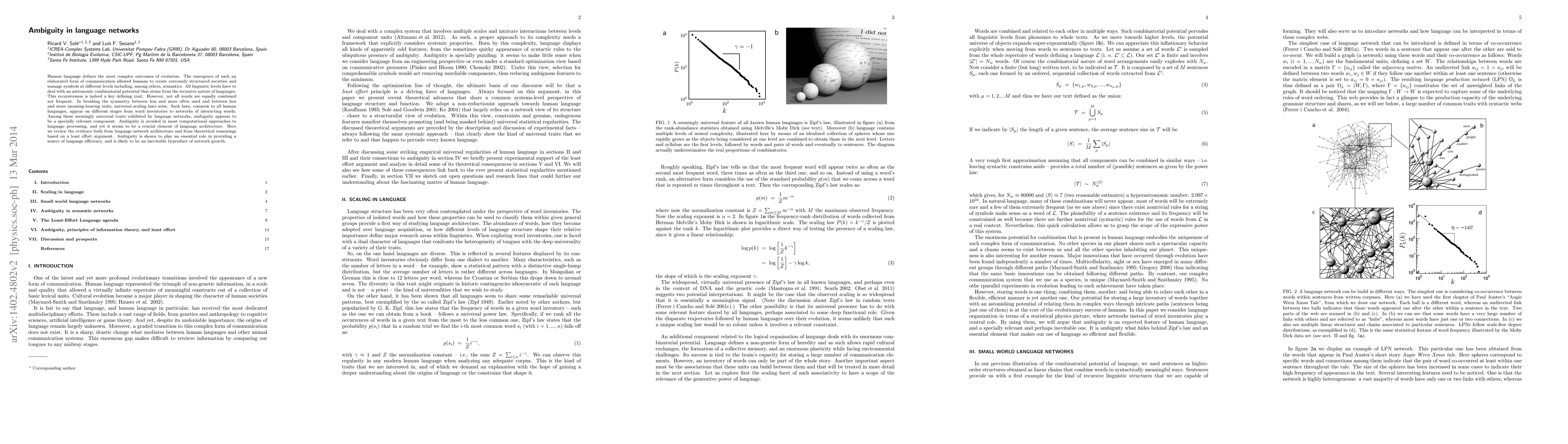 Human language defines the most complex outcomes of evolution. The emergence of such an elaborated form of communication allowed humans to create extremely structured societies and manage symbols at different levels including, among others, semantics. All linguistic levels have to deal with an astronomic combinatorial potential that stems from the recursive nature of languages. This recursiveness is indeed a key defining trait. However, not all words are equally combined nor frequent. In breaking the symmetry between less and more often used and between less and more meaning-bearing units, universal scaling laws arise. Such laws, common to all human languages, appear on different stages from word inventories to networks of interacting words. Among these seemingly universal traits exhibited by language networks, ambiguity appears to be a specially relevant component. Ambiguity is avoided in most computational approaches to language processing, and yet it seems to be a crucial element of language architecture. Here we review the evidence both from language network architecture and from theoretical reasonings based on a least effort argument. Ambiguity is shown to play an essential role in providing a source of language efficiency, and is likely to be an inevitable byproduct of network growth.