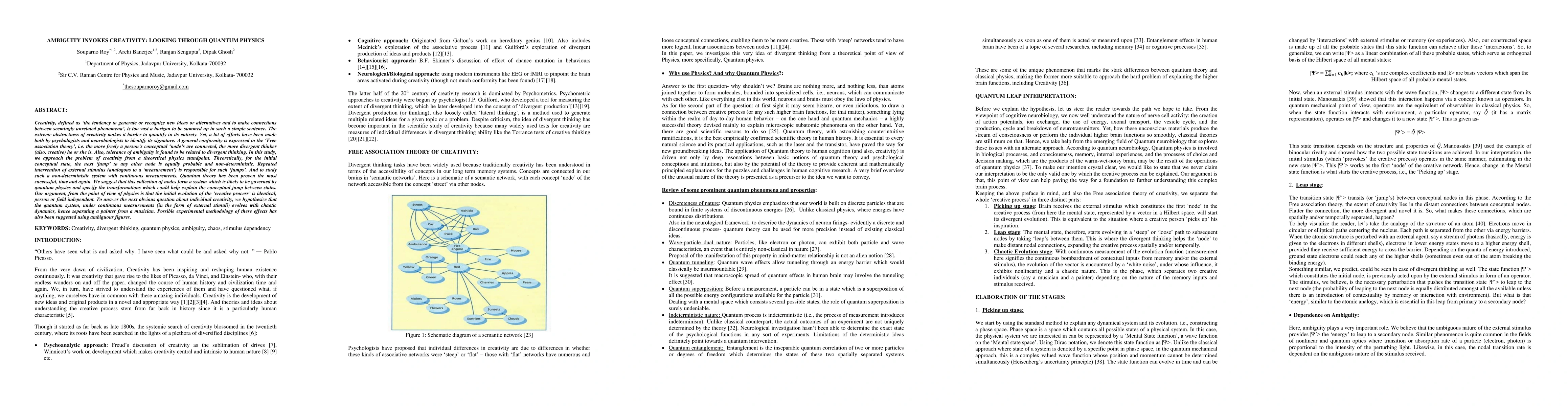 Creativity, defined as the tendency to generate or recognize new ideas or alternatives and to make connections between seemingly unrelated phenomena, is too vast a horizon to be summed up in such a simple sentence. The extreme abstractness of creativity makes it harder to quantify in its entirety. Yet, a lot of efforts have been made both by psychologists and neurobiologists to identify its signature. A general conformity is expressed in the Free association theory, i.e. the more freely a persons conceptual nodes are connected, the more divergent thinker (also, creative) he or she is. Also, tolerance of ambiguity is found to be related to divergent thinking. In this study, we approach the problem of creativity from a theoretical physics standpoint. Theoretically, for the initial conceptual state, the next jump to any other node is equally probable and non-deterministic. Repeated intervention of external stimulus (analogous to a measurement) is responsible for such jumps. And to study such a non-deterministic system with continuous measurements, Quantum theory has been proven the most successful, time and again. We suggest that this collection of nodes form a system which is likely to be governed by quantum physics and specify the transformations which could help explain the conceptual jump between states. Our argument, from the point of view of physics is that the initial evolution of the creative process is identical, person or field independent. To answer the next obvious question about individual creativity, we hypothesize that the quantum system, under continuous measurements (in the form of external stimuli) evolves with chaotic dynamics, hence separating a painter from a musician. Possible experimental methodology of these effects has also been suggested using ambiguous figures.