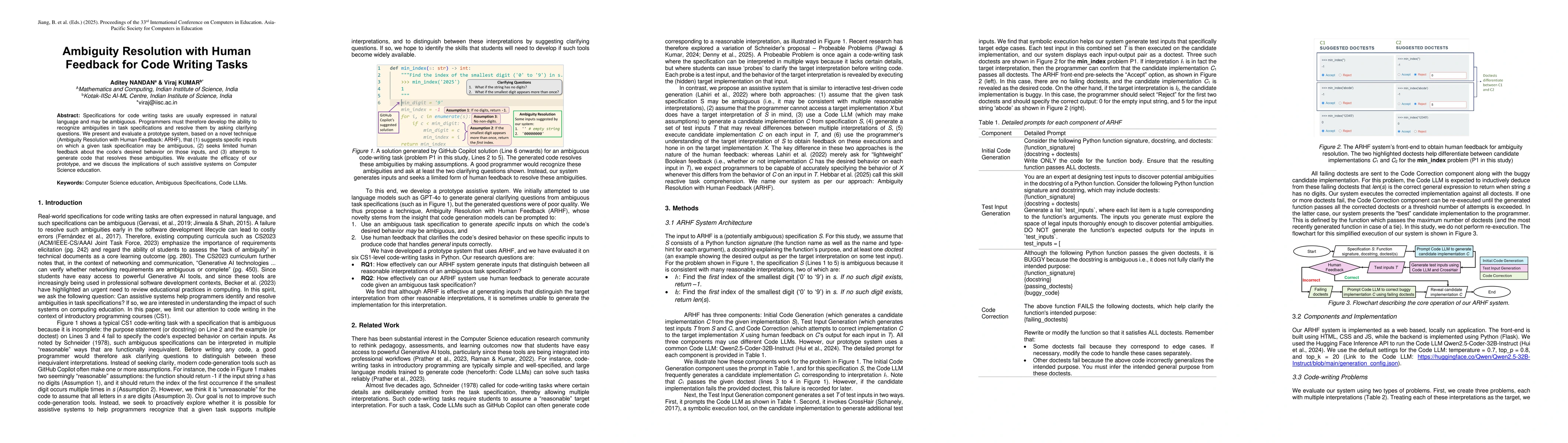 Specifications for code writing tasks are usually expressed in natural language and may be ambiguous. Programmers must therefore develop the ability to recognize ambiguities in task specifications and resolve them by asking clarifying questions. We present and evaluate a prototype system, based on a novel technique (ARHF: Ambiguity Resolution with Human Feedback), that (1) suggests specific inputs on which a given task specification may be ambiguous, (2) seeks limited human feedback about the code's desired behavior on those inputs, and (3) uses this feedback to generate code that resolves these ambiguities. We evaluate the efficacy of our prototype, and we discuss the implications of such assistive systems on Computer Science education.
