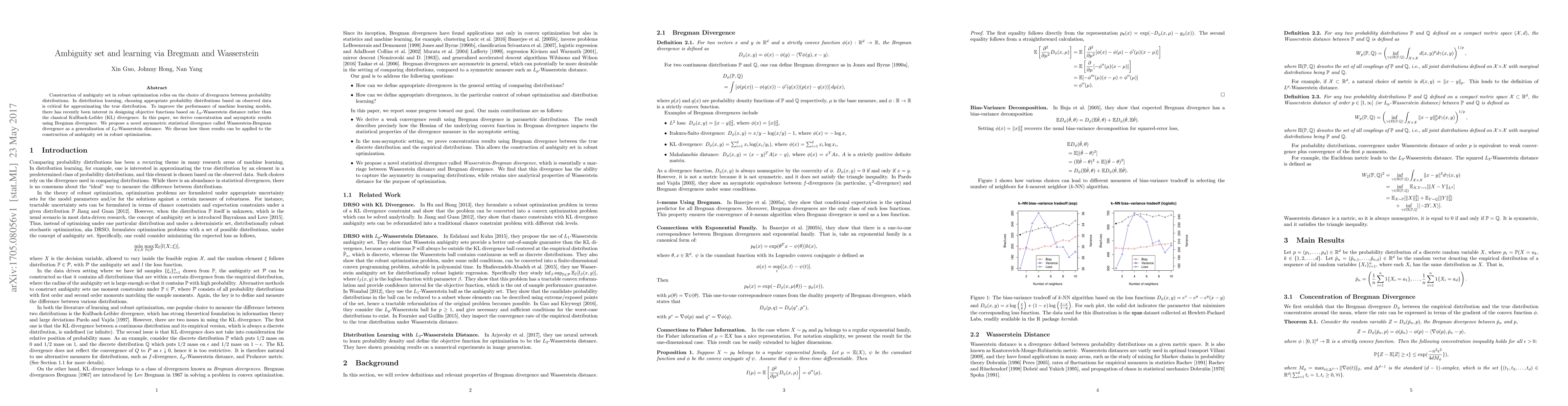 Construction of ambiguity set in robust optimization relies on the choice of divergences between probability distributions. In distribution learning, choosing appropriate probability distributions based on observed data is critical for approximating the true distribution. To improve the performance of machine learning models, there has recently been interest in designing objective functions based on Lp-Wasserstein distance rather than the classical Kullback-Leibler (KL) divergence. In this paper, we derive concentration and asymptotic results using Bregman divergence. We propose a novel asymmetric statistical divergence called Wasserstein-Bregman divergence as a generalization of L2-Wasserstein distance. We discuss how these results can be applied to the construction of ambiguity set in robust optimization.
