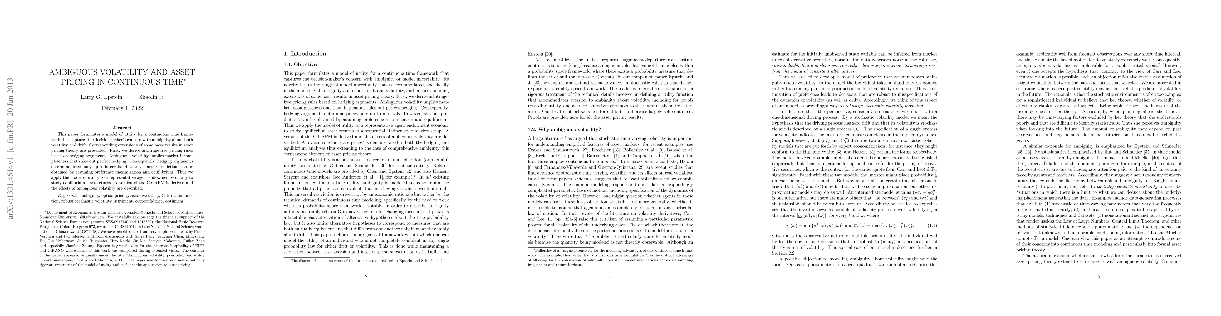 This paper formulates a model of utility for a continuous time framework that captures the decision-maker's concern with ambiguity about both volatility and drift. Corresponding extensions of some basic results in asset pricing theory are presented. First, we derive arbitrage-free pricing rules based on hedging arguments. Ambiguous volatility implies market incompleteness that rules out perfect hedging. Consequently, hedging arguments determine prices only up to intervals. However, sharper predictions can be obtained by assuming preference maximization and equilibrium. Thus we apply the model of utility to a representative agent endowment economy to study equilibrium asset returns. A version of the C-CAPM is derived and the effects of ambiguous volatility are described.