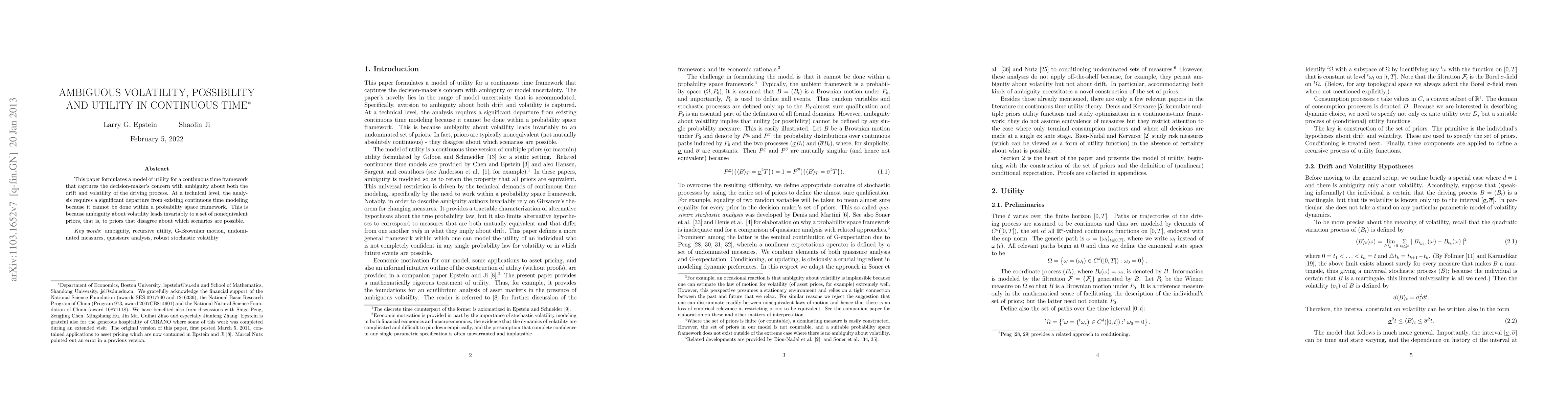 This paper develops a new model of utility that accounts for ambiguity in continuous time frameworks, specifically focusing on volatility, allowing for multiple possible scenarios to arise from the same probability space.