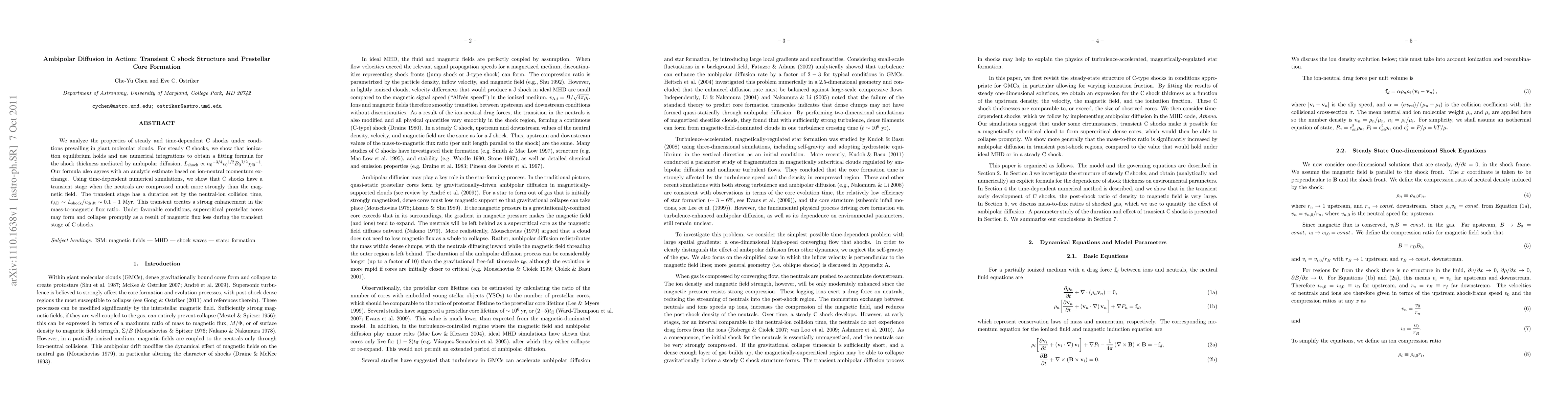 This paper investigates the transient C shock structures in giant molecular clouds, demonstrating how ambipolar diffusion affects shock thickness and leads to the formation of supercritical prestellar cores through enhanced mass-to-magnetic flux ratios during the shock's transient phase. The study combines numerical simulations and analytical estimates to explain these processes.