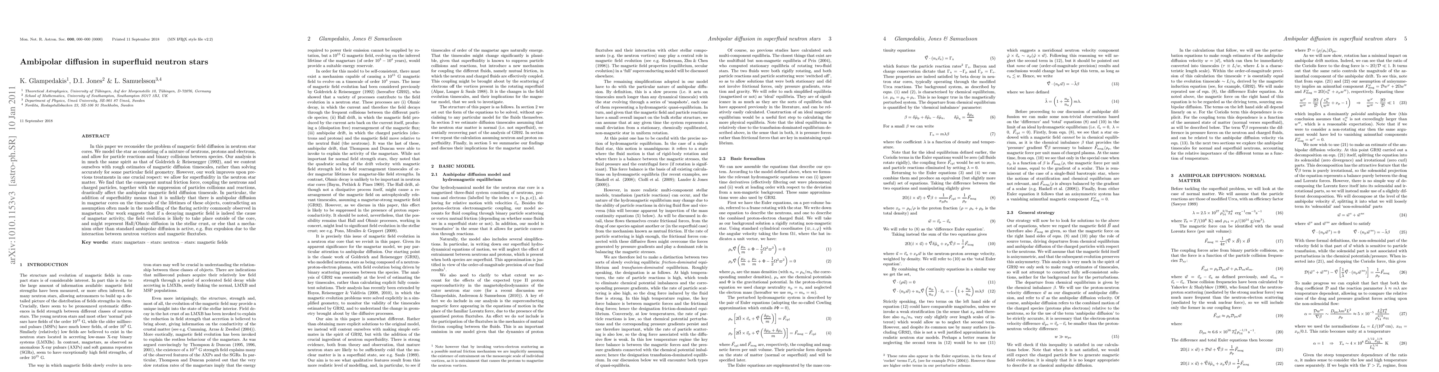 This paper examines magnetic field diffusion in neutron star cores, considering superfluidity and its impact on ambipolar diffusion. It finds that superfluidity significantly alters diffusion timescales, suggesting that ambipolar diffusion is unlikely in magnetar cores, implying alternative magnetic field decay mechanisms.