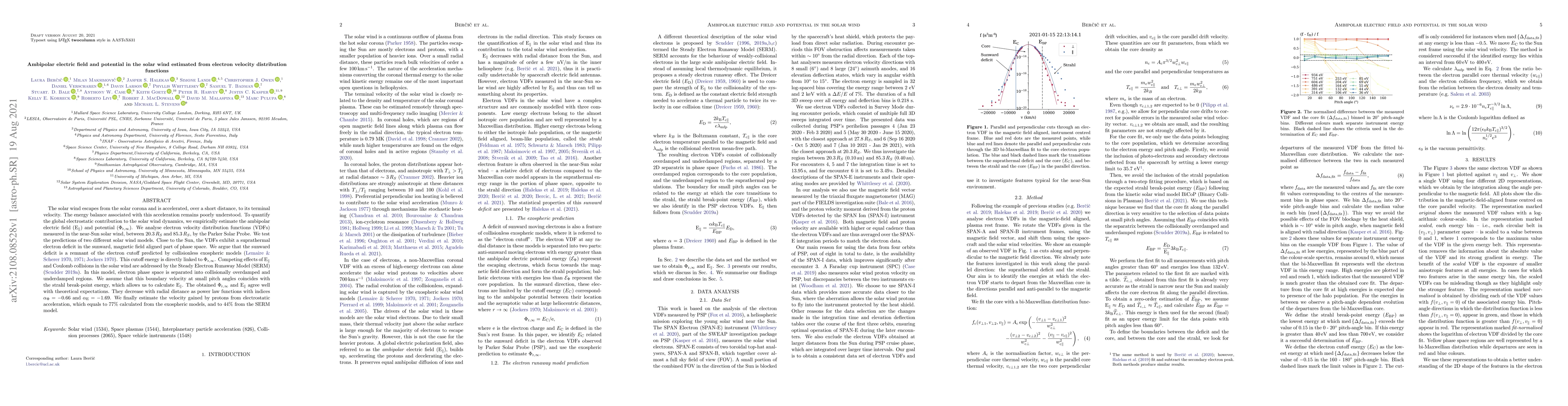 This research estimates the ambipolar electric field and potential in the solar wind using electron velocity distribution functions measured by the Parker Solar Probe. The study finds that these quantities decrease with distance from the Sun and supports theoretical models predicting the electrostatic acceleration of protons.