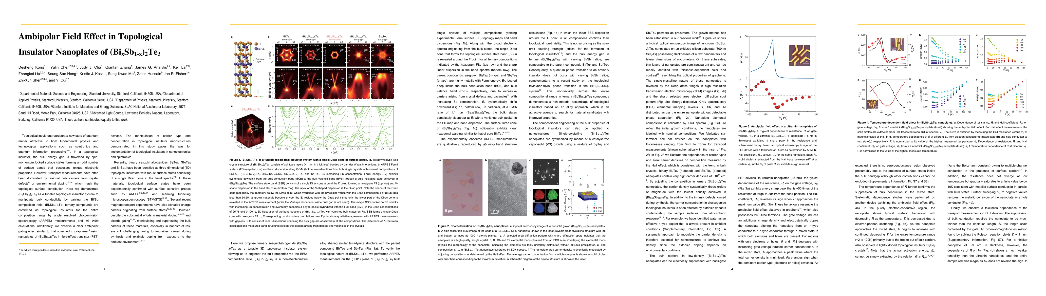 This paper demonstrates that (BixSb1-x)2Te3 ternary compounds exhibit tunable topological insulating properties, confirmed by ARPES and ab initio calculations. It also shows an ambipolar field effect in nanoplates, suggesting potential for applications in nanoelectronics and spintronics.