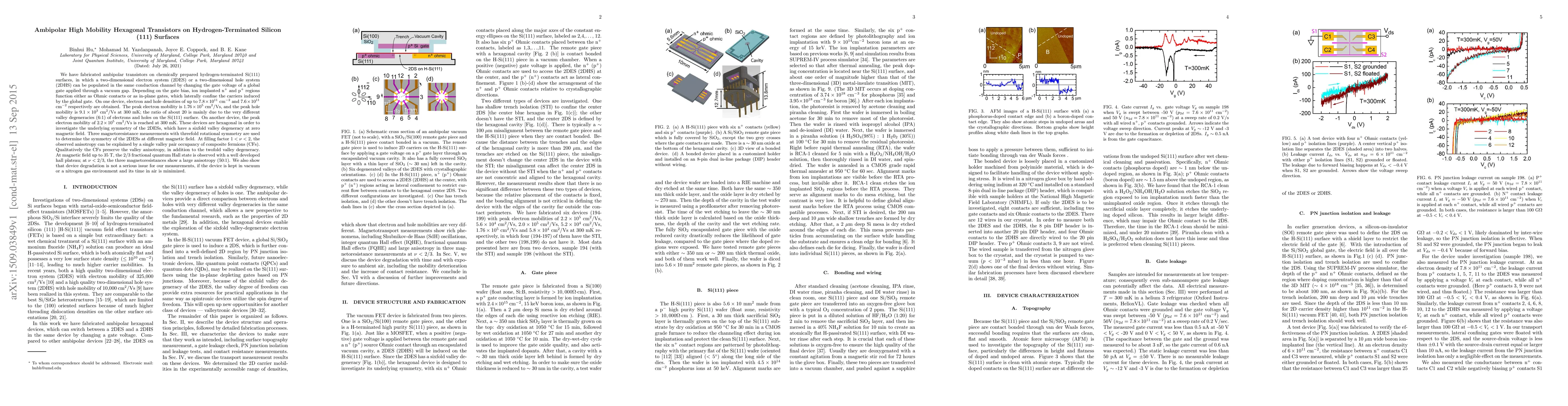 We have fabricated ambipolar transistors on chemically prepared hydrogen-terminated Si(111) surfaces, in which a two-dimensional electron system (2DES) or a two-dimensional hole system (2DHS) can be populated in the same conduction channel by changing the gate voltage of a global gate applied through a vacuum gap. Depending on the gate bias, ion implanted n$^+$ and p$^+$ regions function either as Ohmic contacts or as in-plane gates, which laterally confine the carriers induced by the global gate. On one device, electron and hole densities of up to $7.8\times10^{11}$ cm$^{-2}$ and $7.6\times10^{11}$ cm$^{-2}$ respectively are obtained. The peak electron mobility is $1.76\times10^5$ cm$^{2}$/Vs, and the peak hole mobility is $9.1\times10^3$ cm$^{2}$/Vs at 300 mK; the ratio of about 20 is mainly due to the very different valley degeneracies (6:1) of electrons and holes on the Si(111) surface. On another device, the peak electron mobility of $2.2\times10^5$ cm$^{2}$/Vs is reached at 300 mK. These devices are hexagonal in order to investigate the underlying symmetry of the 2DESs, which have a sixfold valley degeneracy at zero magnetic field. Three magnetoresistance measurements with threefold rotational symmetry are used to determine the symmetry of the 2DESs at different magnetic field. At filling factor $1 < \nu < 2$, the observed anisotropy can be explained by a single valley pair occupancy of composite fermions (CFs). Qualitatively the CFs preserve the valley anisotropy, in addition to the twofold valley degeneracy. At magnetic field up to 35 T, the 2/3 fractional quantum Hall state is observed with a well developed hall plateau; at $\nu<2/3$, the three magnetoresistances show a large anisotropy (50:1). We also show that device degradation is not a serious issue for our measurements, if the device is kept in vacuum or a nitrogen gas environment and its time in air is minimized.