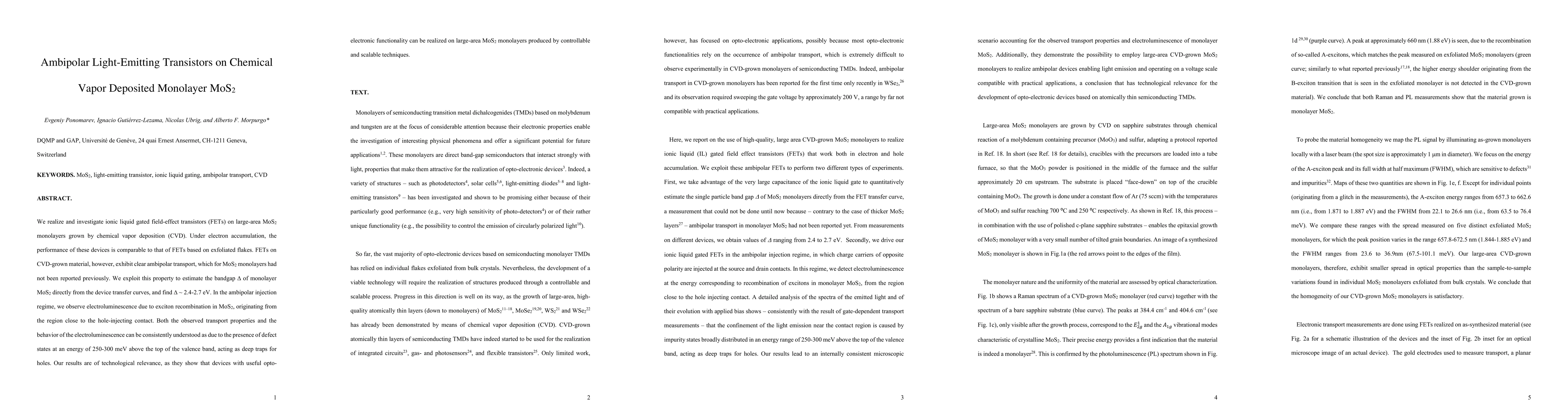 This paper demonstrates ambipolar field-effect transistors on large-area monolayer MoS2 grown via CVD, revealing a bandgap of 2.4-2.7 eV and electroluminescence due to exciton recombination near the hole-contact. The observed properties are attributed to defect states acting as deep hole traps.