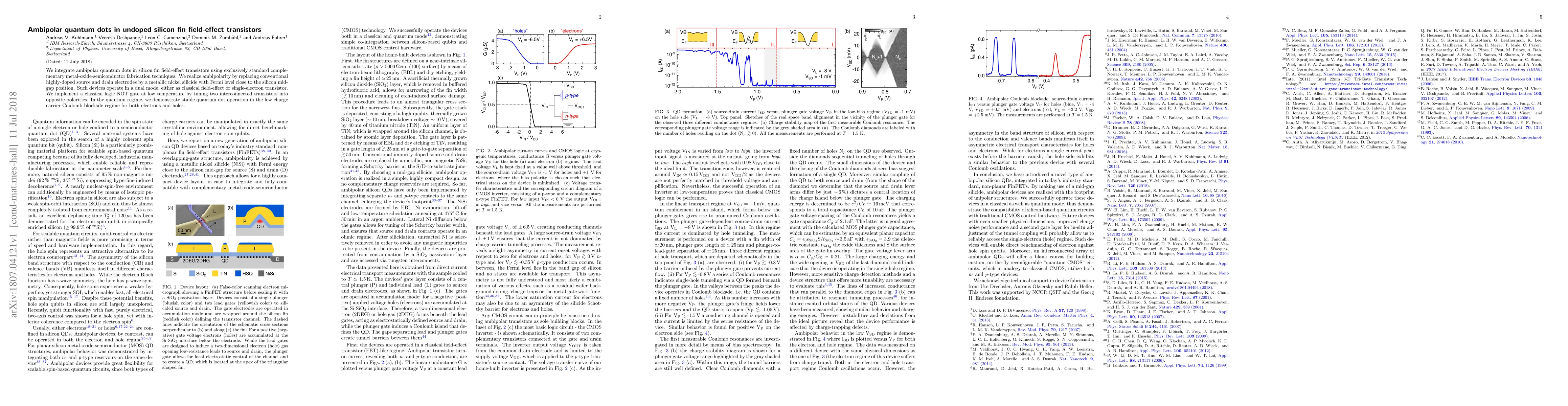 This paper describes the integration of ambipolar quantum dots into silicon fin field-effect transistors using standard fabrication methods. The authors achieve ambipolarity by utilizing a metallic nickel silicide, enabling dual mode operation and demonstrating stable quantum dot behavior in the Coulomb blockade regime for both electrons and holes.