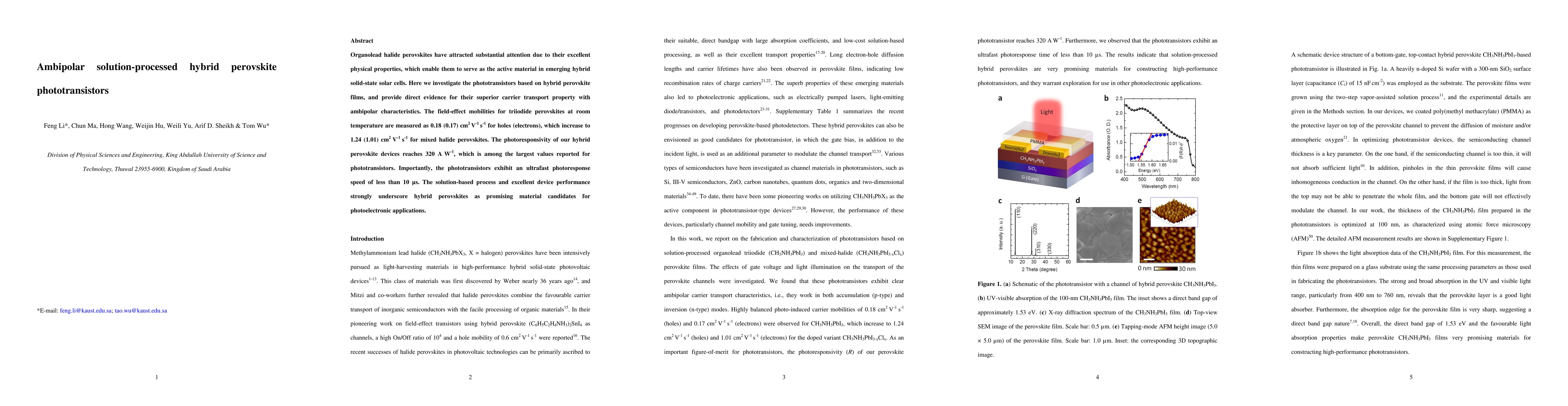 This study demonstrates the superior carrier transport and photoelectronic properties of ambipolar solution-processed hybrid perovskite phototransistors, achieving high field-effect mobilities and ultrafast photoresponse speeds, thus positioning hybrid perovskites as promising candidates for photoelectronic applications.