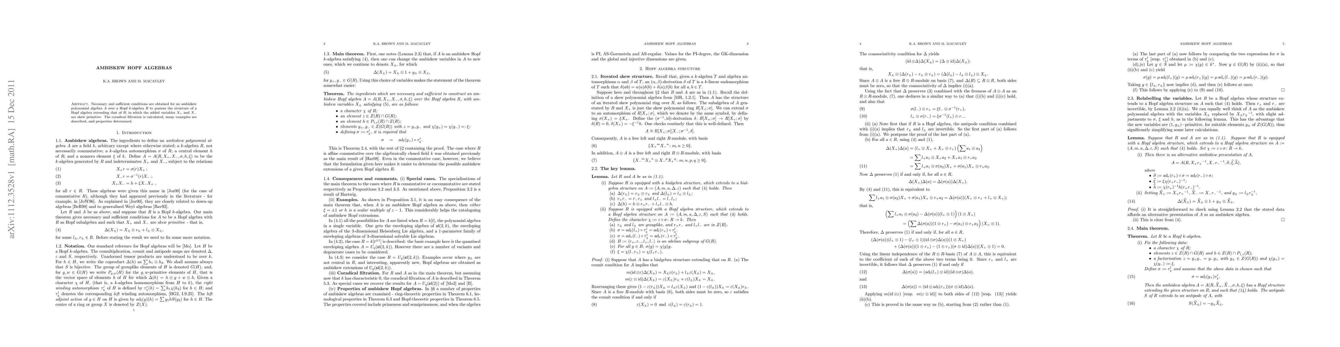 Necessary and sufficient conditions are obtained for an ambiskew polynomial algebra A over a Hopf k-algebra R to possess the structure of a Hopf algebra extending that of R, in which the added variables X+ and X- are skew primitive. The coradical filtration is calculated, many examples are described, and properties determined.