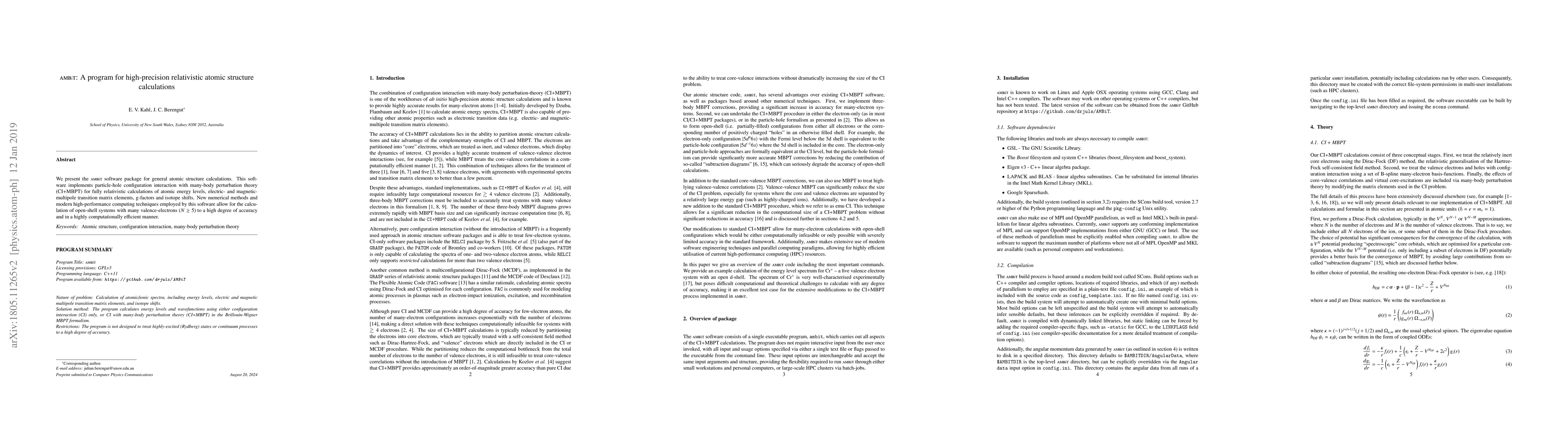 The AMBiT software package performs high-precision, relativistic atomic structure calculations using particle-hole configuration interaction with many-body perturbation theory. It efficiently computes atomic energy levels, transition matrix elements, g-factors, and isotope shifts for open-shell systems with many valence electrons.