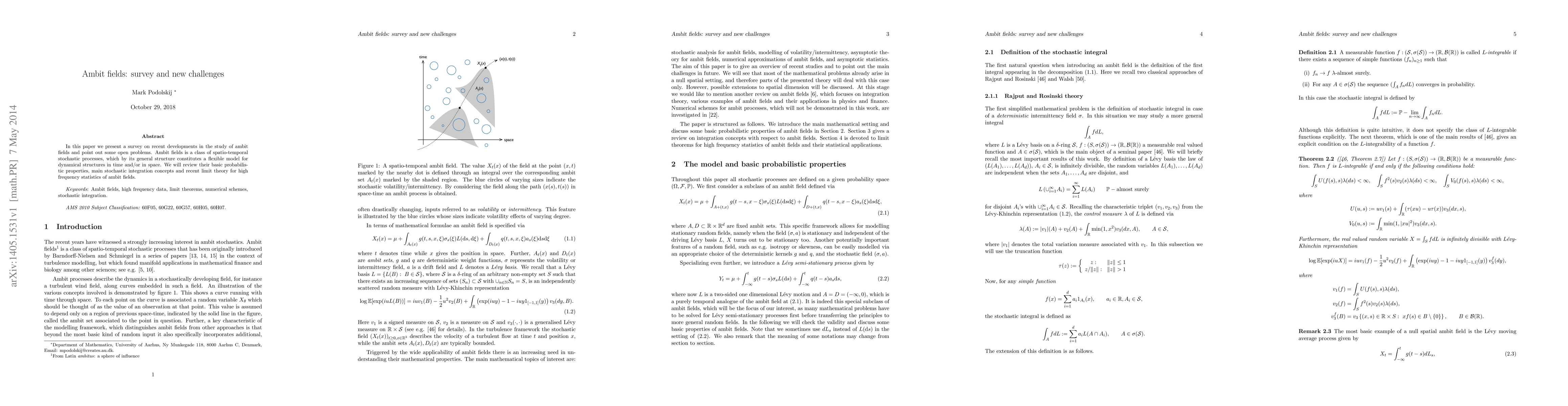 In this paper we present a survey on recent developments in the study of ambit fields and point out some open problems. Ambit fields is a class of spatio-temporal stochastic processes, which by its general structure constitutes a flexible model for dynamical structures in time and/or in space. We will review their basic probabilistic properties, main stochastic integration concepts and recent limit theory for high frequency statistics of ambit fields.