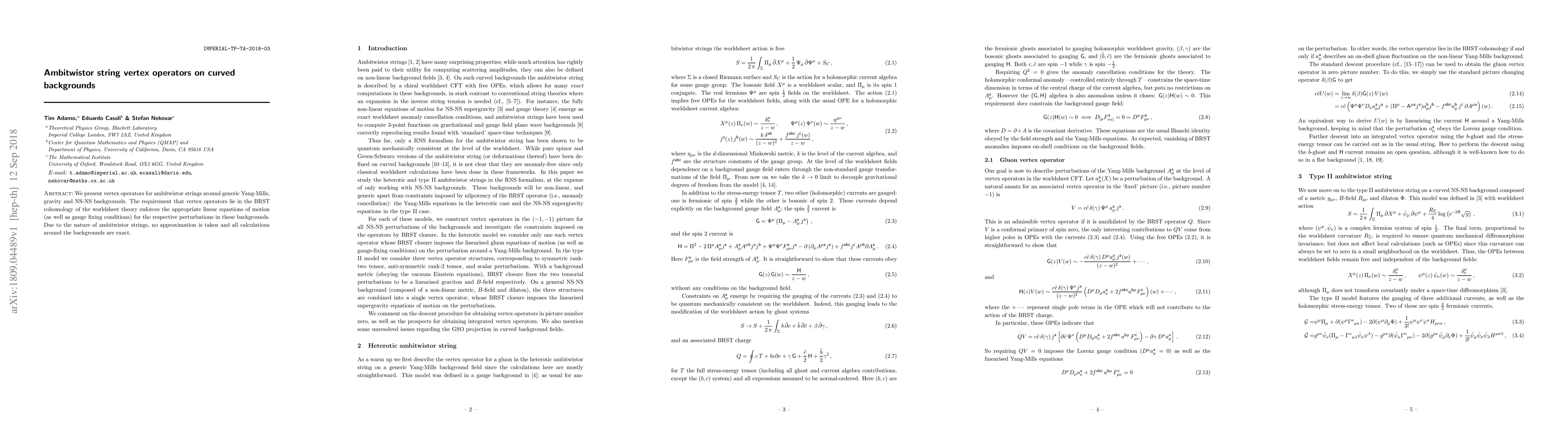 This paper introduces vertex operators for ambitwistor strings on curved backgrounds, enforcing the correct equations of motion and gauge fixing conditions without approximations, ensuring exact calculations for Yang-Mills, gravity, and NS-NS backgrounds.
