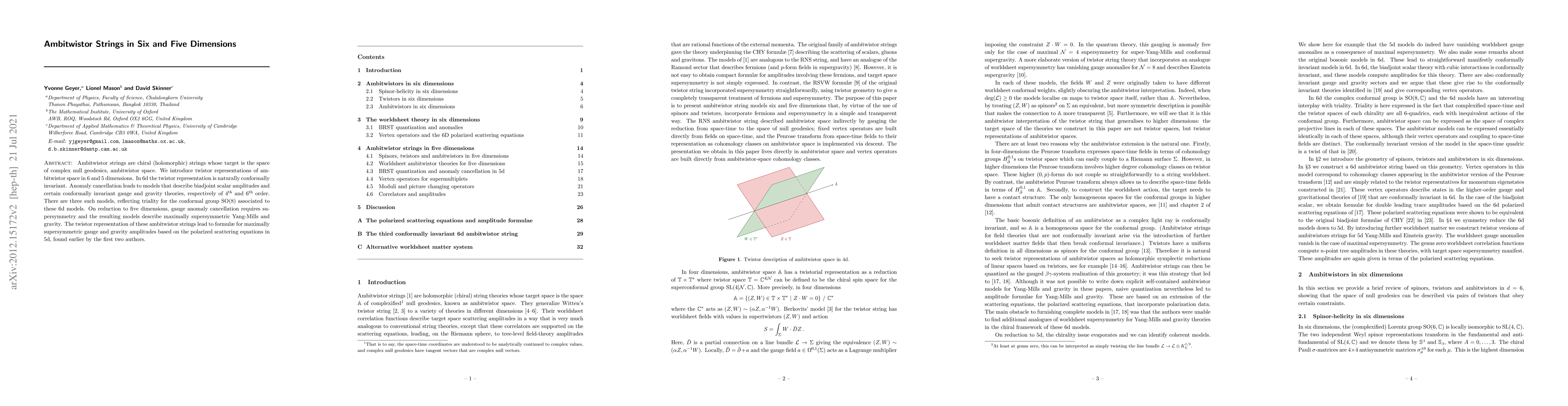 Ambitwistor strings are chiral (holomorphic) strings whose target is the space of complex null geodesics, ambitwistor space. We introduce twistor representations of ambitwistor space in 6 and 5 dimensions. In 6d the twistor representation is naturally conformally invariant. Anomaly cancellation leads to models that describe biadjoint scalar amplitudes and certain conformally invariant gauge and gravity theories, respectively of 4$^{\rm th}$ and 6$^{\rm th}$ order. There are three such models, reflecting triality for the conformal group SO(8) associated to these 6d models. On reduction to five dimensions, gauge anomaly cancellation requires supersymmetry and the resulting models describe maximally supersymmetric Yang-Mills and gravity. The twistor representation of these ambitwistor strings lead to formul{\ae} for maximally supersymmetric gauge and gravity amplitudes based on the polarized scattering equations in 5d, found earlier by the first two authors.
