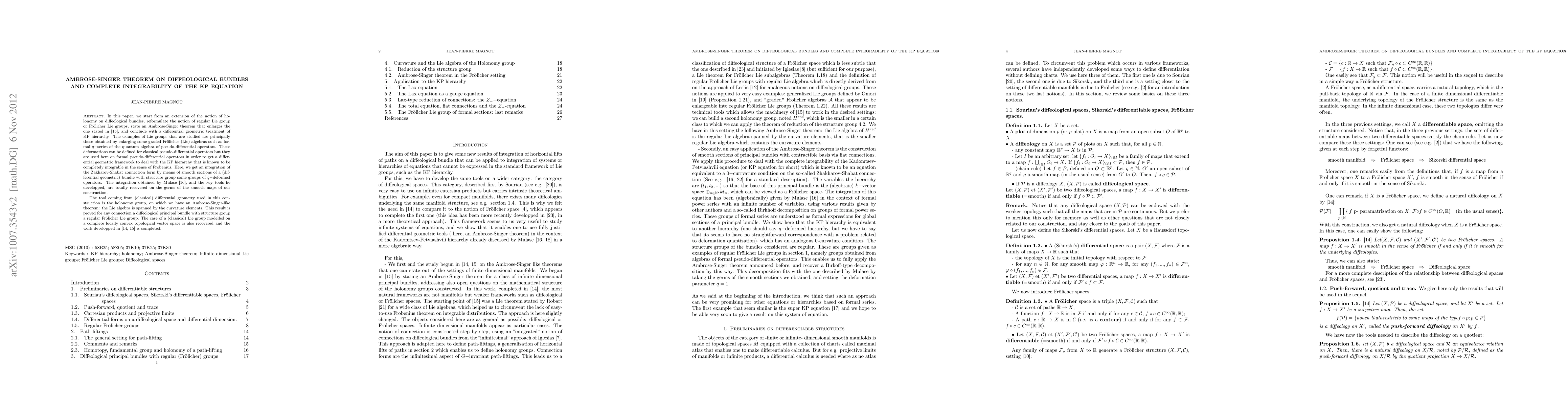 This paper extends the Ambrose-Singer theorem to diffeological bundles, reformulating regular Lie groups and Fr\"olicher Lie groups. It applies these concepts to the KP hierarchy, proving complete integrability via a differential geometric framework involving $q$-deformed operators and holonomy groups.