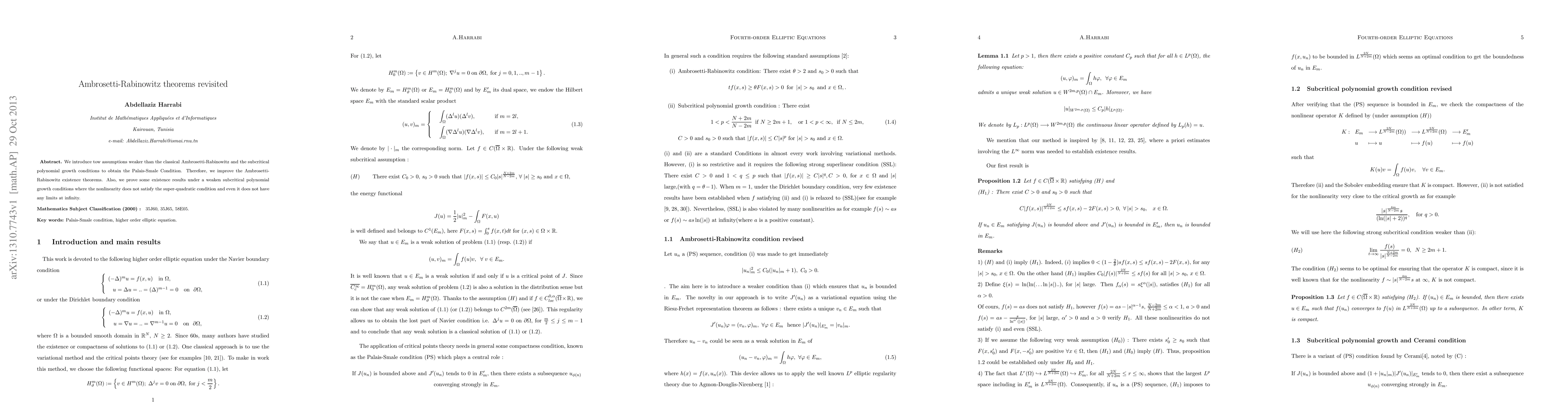Summary: This paper introduces two weaker assumptions than the classical Ambrosetti-Rabinowitz conditions to achieve the Palais-Smale Condition, thereby improving the Ambrosetti-Rabinowitz existence theorems. It also proves existence results under relaxed subcritical polynomial growth conditions without requiring super-quadraticity or limits at infinity.