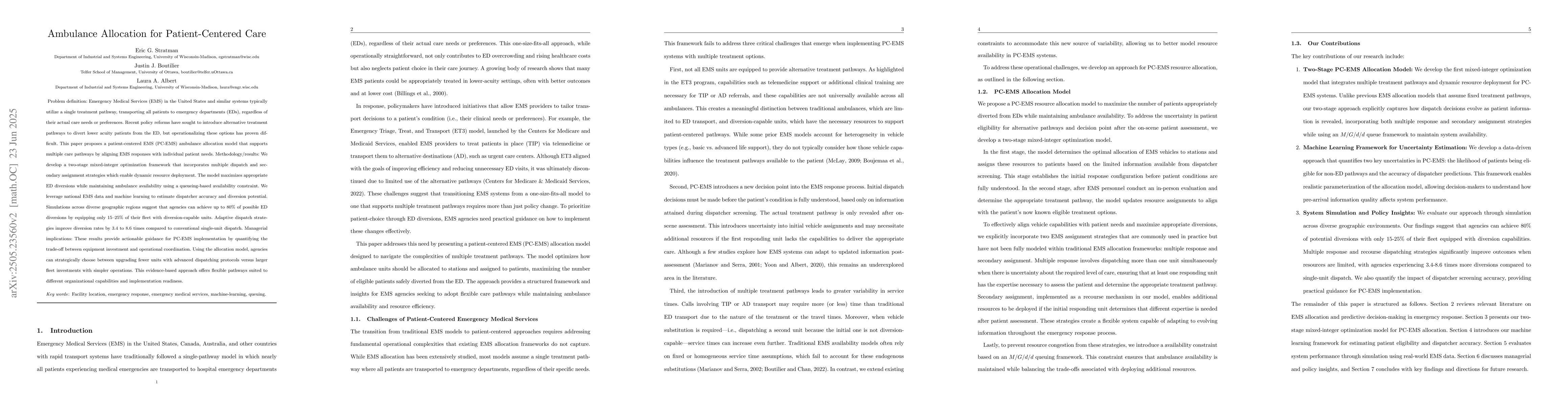 This research develops a two-stage mixed-integer optimization framework for patient-centered emergency medical services (PC-EMS) ambulance allocation, incorporating multiple dispatch and secondary assignment strategies for dynamic resource deployment.