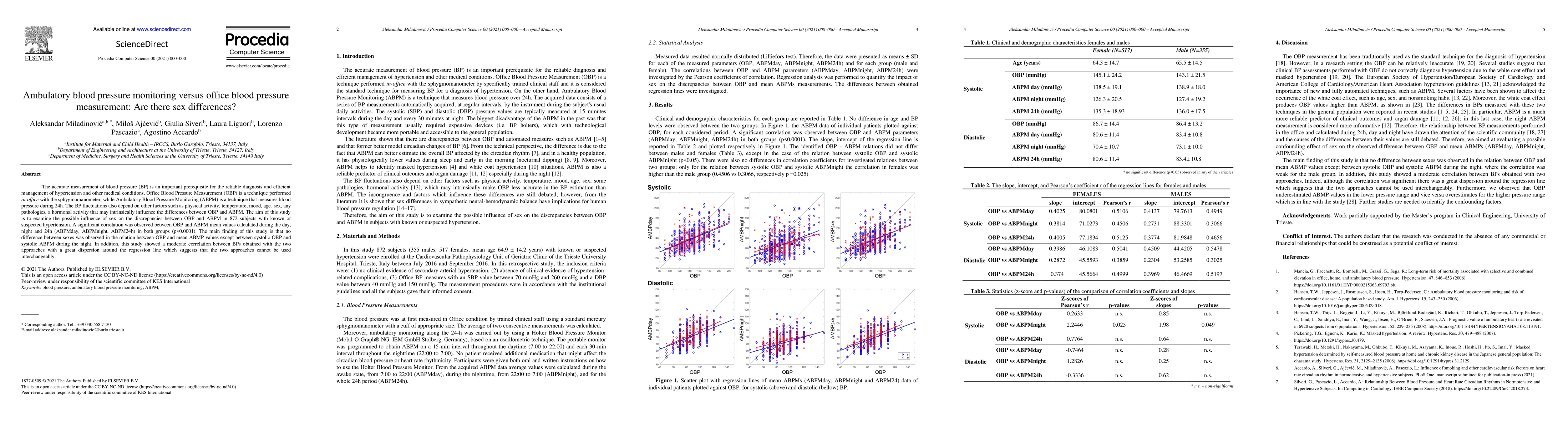 This study investigates sex differences in the discrepancies between Office Blood Pressure Measurement (OBP) and Ambulatory Blood Pressure Monitoring (ABPM) in 872 hypertensive subjects. No significant sex differences were found in the overall relationship between OBP and ABPM, except for a minor difference in systolic blood pressure during the night.