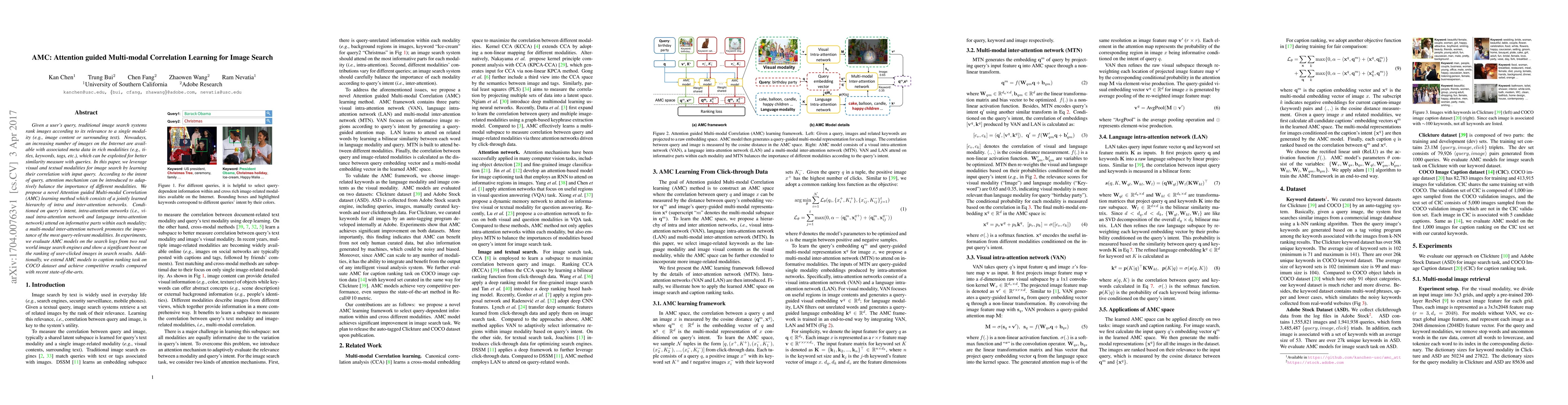 Given a user's query, traditional image search systems rank images according to its relevance to a single modality (e.g., image content or surrounding text). Nowadays, an increasing number of images on the Internet are available with associated meta data in rich modalities (e.g., titles, keywords, tags, etc.), which can be exploited for better similarity measure with queries. In this paper, we leverage visual and textual modalities for image search by learning their correlation with input query. According to the intent of query, attention mechanism can be introduced to adaptively balance the importance of different modalities. We propose a novel Attention guided Multi-modal Correlation (AMC) learning method which consists of a jointly learned hierarchy of intra and inter-attention networks. Conditioned on query's intent, intra-attention networks (i.e., visual intra-attention network and language intra-attention network) attend on informative parts within each modality; a multi-modal inter-attention network promotes the importance of the most query-relevant modalities. In experiments, we evaluate AMC models on the search logs from two real world image search engines and show a significant boost on the ranking of user-clicked images in search results. Additionally, we extend AMC models to caption ranking task on COCO dataset and achieve competitive results compared with recent state-of-the-arts.