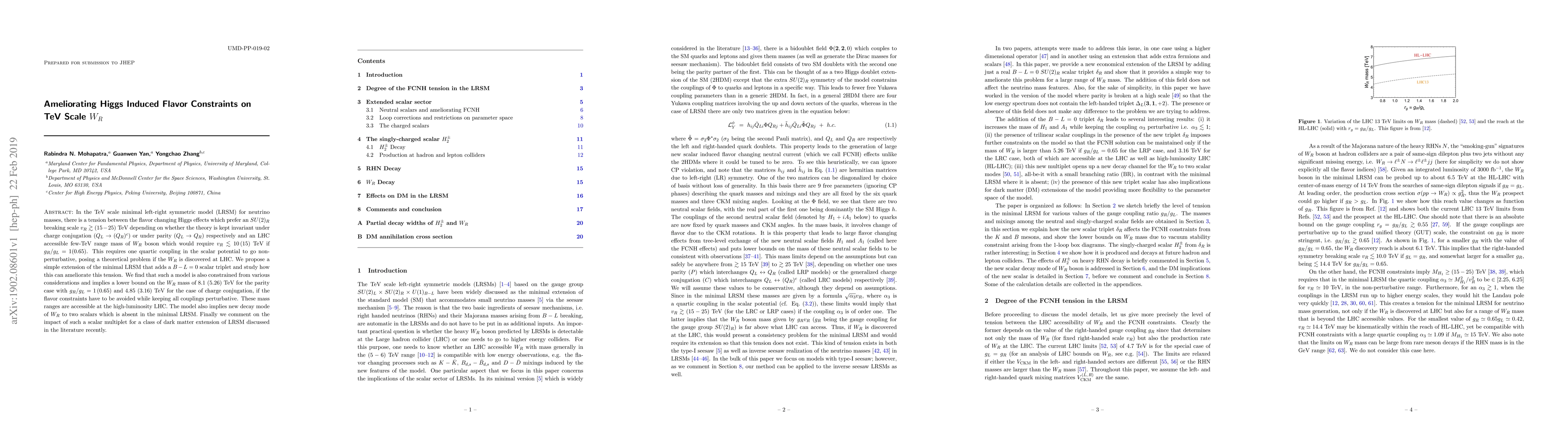 In the TeV scale minimal left-right symmetric model (LRSM) for neutrino masses, there is a tension between the flavor changing Higgs effects which prefer an $SU(2)_R$ breaking scale $v_R \gtrsim (15-25)$ TeV depending on whether the theory is kept invariant under charge conjugation ($Q_L\to (Q_R)^c$) or under parity ($Q_L\to Q_R$) respectively and an LHC accessible few-TeV range mass of $W_R$ boson which would require $v_R \lesssim 10 \, (15)$ TeV if $g_R/g_L = 1 (0.65)$. This requires one quartic coupling in the scalar potential to go non-perturbative, posing a theoretical problem if the $W_R$ is discovered at LHC. We propose a simple extension of the minimal LRSM that adds a $B-L=0$ scalar triplet and study how this can ameliorate this tension. We find that such a model is also constrained from various considerations and implies a lower bound on the $W_R$ mass of 8.1 (5.26) TeV for the parity case with $g_R/g_L= 1\, (0.65)$ and 4.85 (3.16) TeV for the case of charge conjugation, if the flavor constraints have to be avoided while keeping all couplings perturbative. These mass ranges are accessible at the high-luminosity LHC. The model also implies new decay mode of $W_R$ to two scalars which is absent in the minimal LRSM. Finally we comment on the impact of such a scalar multiplet for a class of dark matter extension of LRSM discussed in the literature recently.