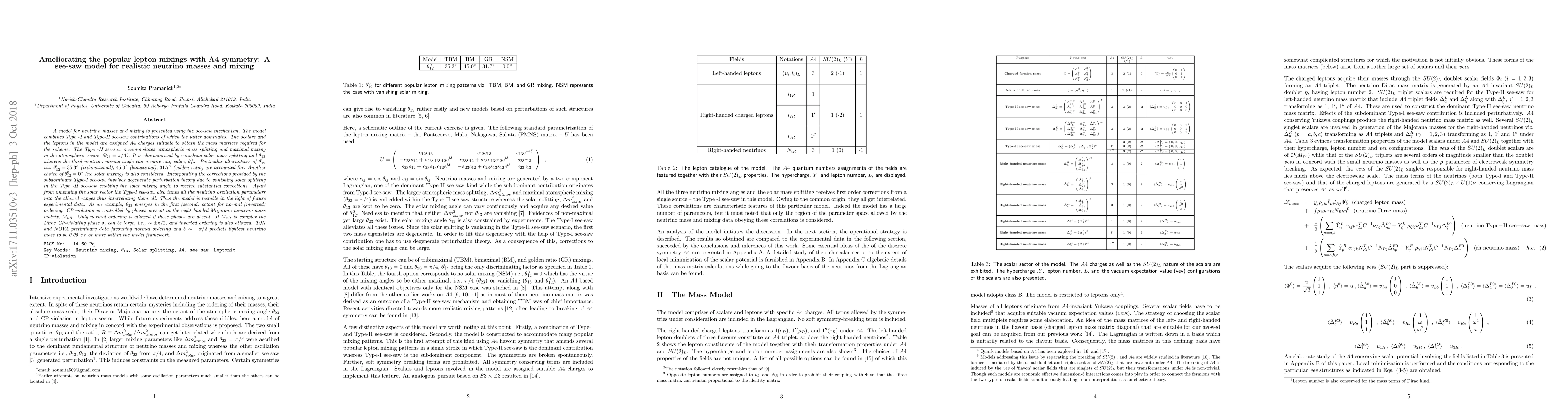 A model for neutrino masses and mixing is devised appointing the see-saw mechanism. The proffered model is fabricated with a combination of Type -I and Type-II see-saw contributions of which the latter dominates. The scalars and the leptons in the model are assigned $A4$ charges conducive to obtain the mass matrices viable for the scheme. The Type -II see-saw mass matrix accommodates atmospheric mass splitting and maximal mixing in the atmospheric sector ($\theta_{23}=\pi/4$). It is characterized by vanishing solar mass splitting and $\theta_{13}$ whereas the third neutrino mixing angle is free to acquire any value of $\theta_{12}^0$. Particular alternatives of $\theta_{12}^0$ corresponding to the popular lepton mixings viz. $\theta_{12}^0=35.3^\circ$ (tribimaximal), $45.0^\circ$ (bimaximal), $31.7^\circ$ (golden ratio) are accounted for. Another choice of $\theta_{12}^0=0^\circ$ (no solar mixing) is reckoned. The subdominant Type-I see-saw constituent of the model propels all the neutrino oscillation parameters into the ranges allowed by the data which in its turn get interrelated owing to their common origin. This makes the model testable in the light of future experimental data. As an example, $\theta_{23}$ emerges in the first (second) octant for normal (inverted) ordering. CP-violation is governed by phases present in the right-handed Majorana neutrino mass matrix, $M_{\nu R}$. Only normal ordering is allowed if these phases are absent. If $M_{\nu R}$ is complex the Dirac CP-violating phase $\delta$, is capable of being large, i.e., $\sim \pm \pi/2$, and inverted ordering of neutrino masses is also permitted. T2K and NOVA preliminary data favouring normal ordering and $\delta \sim -\pi/2$ predicts lightest neutrino mass to be 0.05 eV or more within the framework of this model.