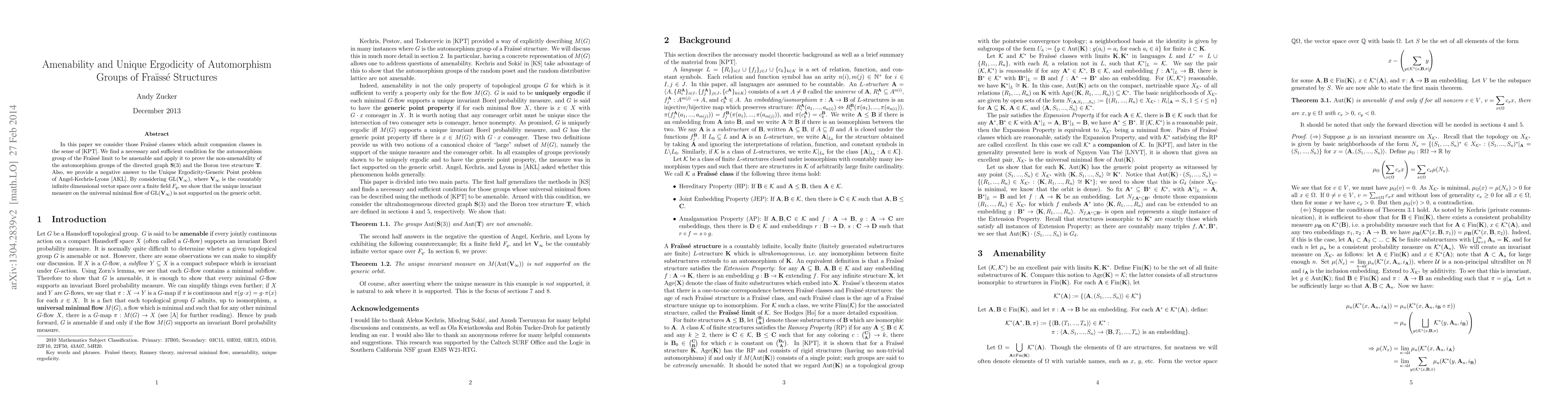 This paper establishes a criterion for the amenability of automorphism groups of Fraissé structures, demonstrating the non-amenability of specific groups like those of $\mathbf{S}(3)$ and $\mathbf{T}$. It also refutes the Unique Ergodicity-Generic Point conjecture by showing $\mathrm{GL}(\mathbf{V}_\infty)$'s unique invariant measure does not align with the generic orbit.