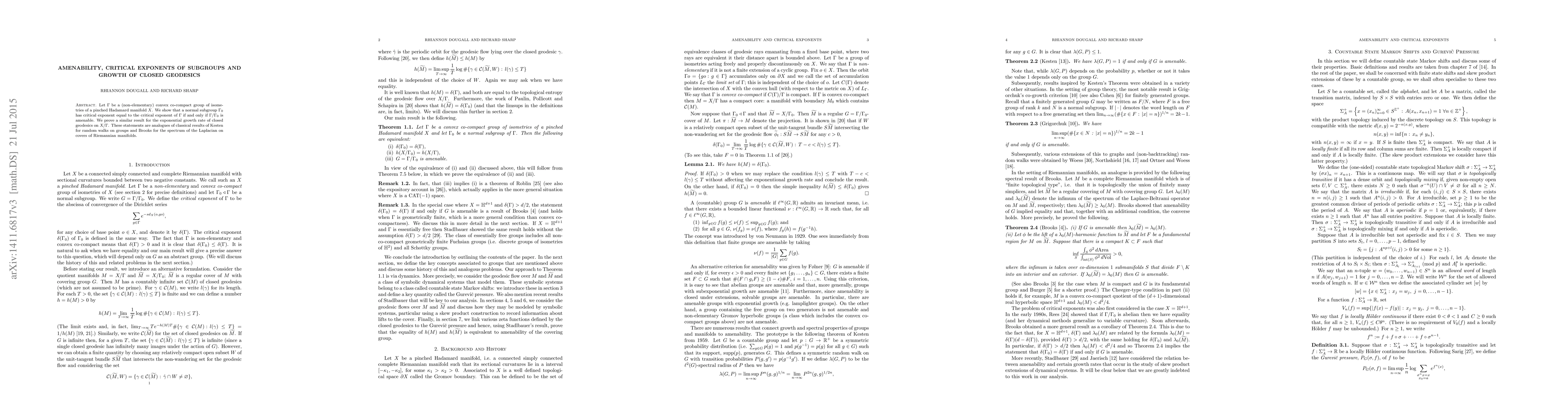 This research establishes that for a convex co-compact group of isometries in a pinched Hadamard manifold, a normal subgroup's critical exponent matches the group's if and only if the quotient group is amenable. Analogous results are proven for the growth rate of closed geodesics in the quotient space. These findings parallel classical results on random walks and Laplacian spectra in group covers of Riemannian manifolds.