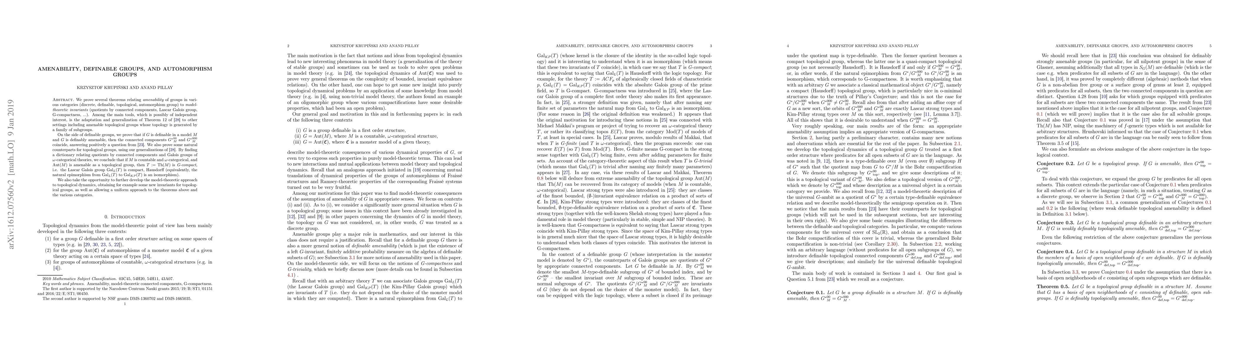 We prove several theorems relating amenability of groups in various categories (discrete, definable, topological, automorphism group) to model-theoretic invariants (quotients by connected components, Lascar Galois group, G-compactness, ...). For example, if $M$ is a countable, $\omega$-categorical structure and $Aut(M)$ is amenable, as a topological group, then the Lascar Galois group $Gal_{L}(T)$ of the theory $T$ of $M$ is compact, Hausdorff (also over any finite set of parameters), that is $T$ is G-compact. An essentially special case is that if $Aut(M)$ is extremely amenable, then $Gal_{L}(T)$ is trivial, so, by a theorem of Lascar, the theory $T$ can be recovered from its category $Mod(T)$ of models. On the side of definable groups, we prove for example that if $G$ is definable in a model $M$, and $G$ is definably amenable, then the connected components ${G^{*}}^{00}_{M}$ and ${G^{*}}^{000}_{M}$ coincide, answering positively a question from an earlier paper of the authors. We also take the opportunity to further develop the model-theoretic approach to topological dynamics, obtaining for example some new invariants for topological groups, as well as allowing a uniform approach to the theorems above and the various categories.