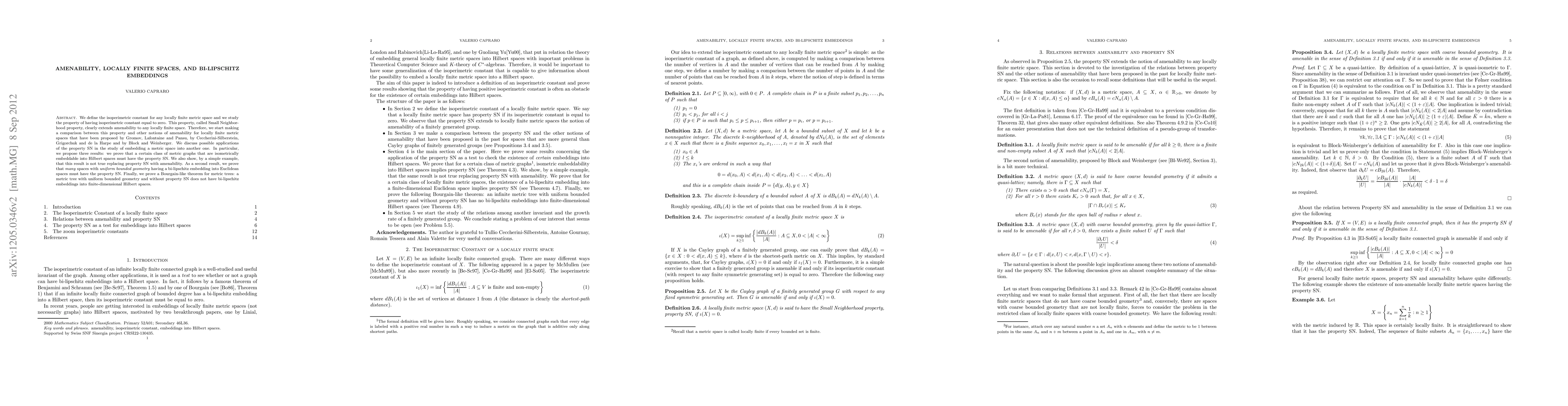 We define the isoperimetric constant for any locally finite metric space and we study the property of having isoperimetric constant equal to zero. This property, called Small Neighborhood property, clearly extends amenability to any locally finite space. Therefore, we start making a comparison between this property and other notions of amenability for locally finite metric spaces that have been proposed by Gromov, Lafontaine and Pansu, by Ceccherini-Silberstein, Grigorchuk and de la Harpe and by Block and Weinberger. We discuss possible applications of the property SN in the study of embedding a metric space into another one. In particular, we propose three results: we prove that a certain class of metric graphs that are isometrically embeddable into Hilbert spaces must have the property SN. We also show, by a simple example, that this result is not true replacing property SN with amenability. As a second result, we prove that \emph{many} spaces with \emph{uniform bounded geometry} having a bi-lipschitz embedding into Euclidean spaces must have the property SN. Finally, we prove a Bourgain-like theorem for metric trees: a metric tree with uniform bounded geometry and without property SN does not have bi-lipschitz embeddings into finite-dimensional Hilbert spaces.