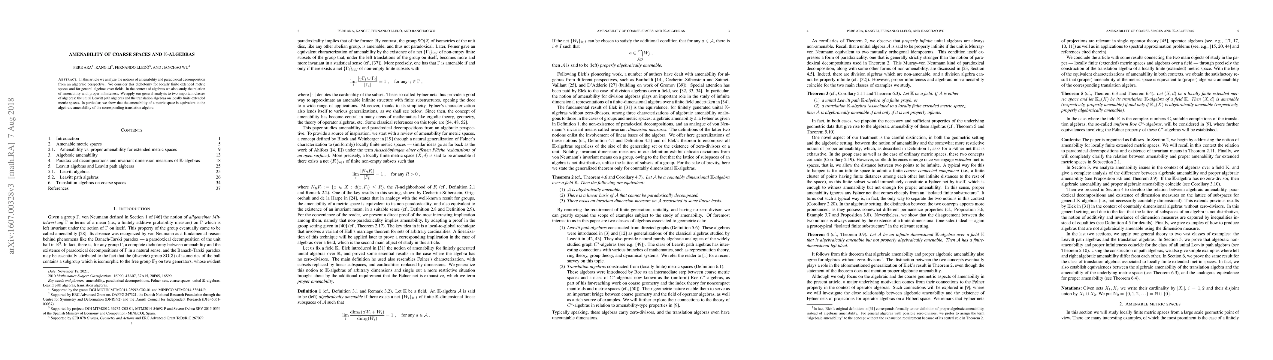 This paper explores the concept of amenability and paradoxical decomposition in coarse spaces and K-algebras, establishing connections between algebraic amenability and proper infiniteness. It demonstrates that the amenability of a metric space aligns with the algebraic amenability of its corresponding translation algebra, applying these findings to unital Leavitt path algebras and translation algebras.