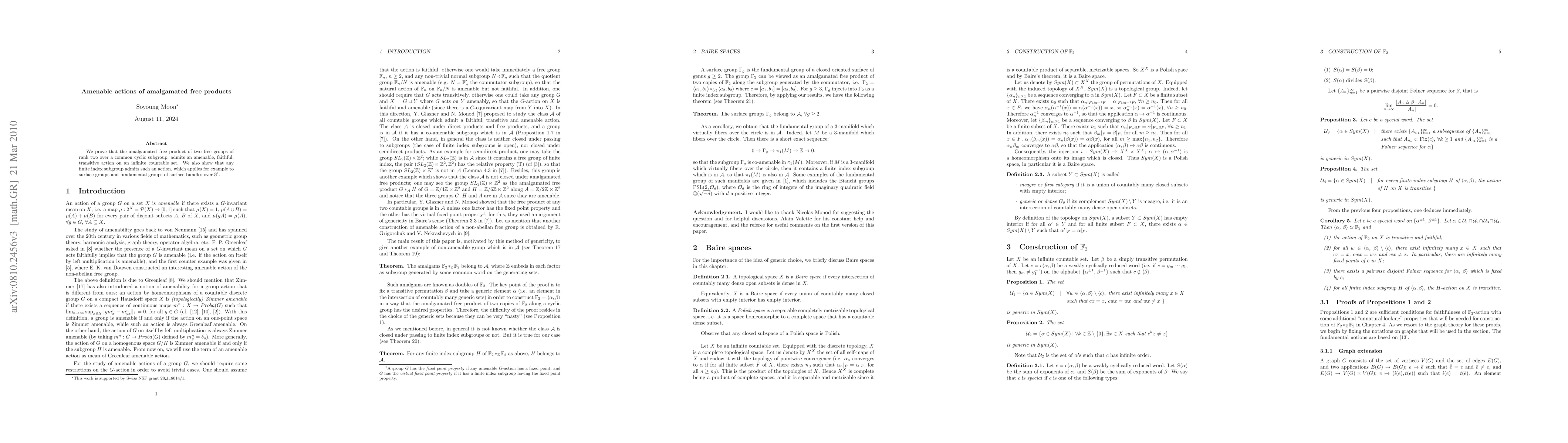We prove that the amalgamated free product of two free groups of rank two over a common cyclic subgroup, admits an amenable, faithful, transitive action on an infinite countable set. We also show that any finite index subgroup admits such an action, which applies for example to surface groups and fundamental groups of surface bundles over $\mathbb{S}^1$.
