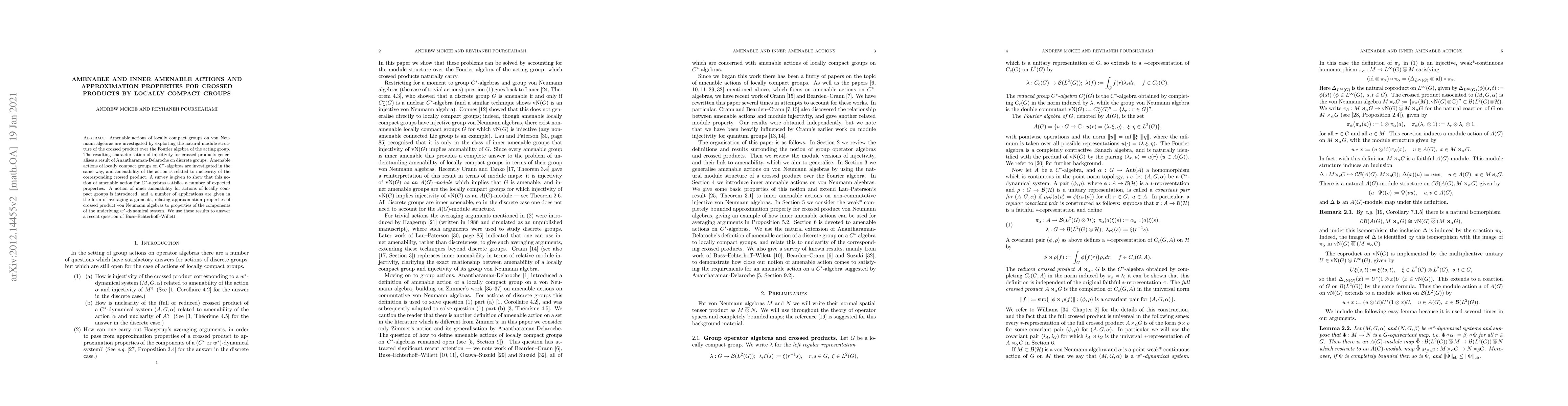 Amenable actions of locally compact groups on von Neumann algebras are investigated by exploiting the natural module structure of the crossed product over the Fourier algebra of the acting group. The resulting characterisation of injectivity for crossed products generalises a result of Anantharaman-Delaroche on discrete groups. Amenable actions of locally compact groups on $C^*$-algebras are investigated in the same way, and amenability of the action is related to nuclearity of the corresponding crossed product. A survey is given to show that this notion of amenable action for $C^*$-algebras satisfies a number of expected properties. A notion of inner amenability for actions of locally compact groups is introduced, and a number of applications are given in the form of averaging arguments, relating approximation properties of crossed product von Neumann algebras to properties of the components of the underlying $w^*$-dynamical system. We use these results to answer a recent question of Buss-Echterhoff-Willett.