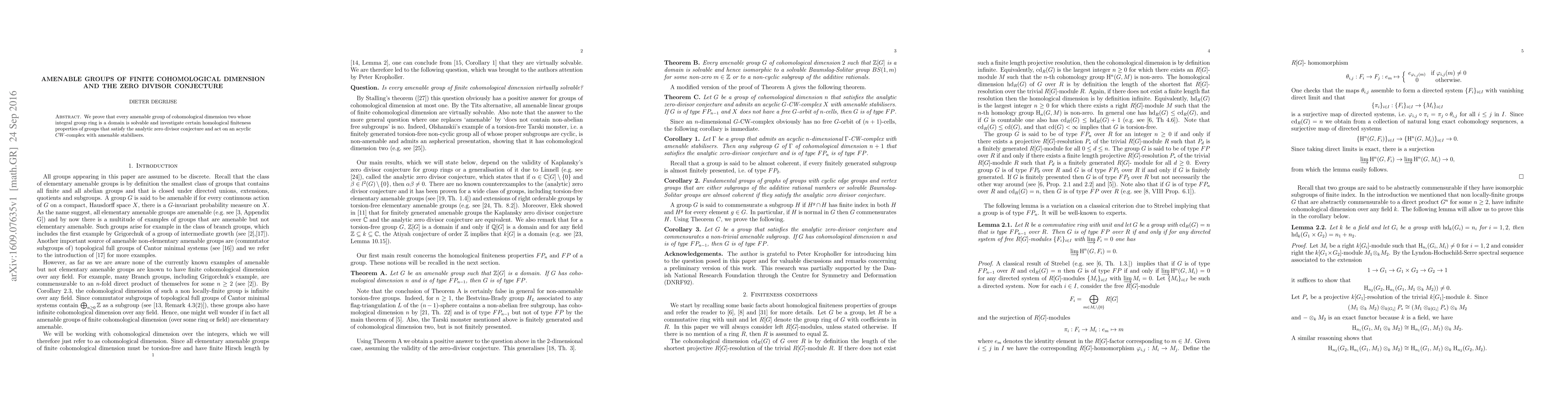 Summary: This paper proves that amenable groups of cohomological dimension two with domain integral group rings are solvable. It also explores the homological finiteness properties of groups that meet the analytic zero divisor conjecture and act on acyclic CW-complexes with amenable stabilizers.