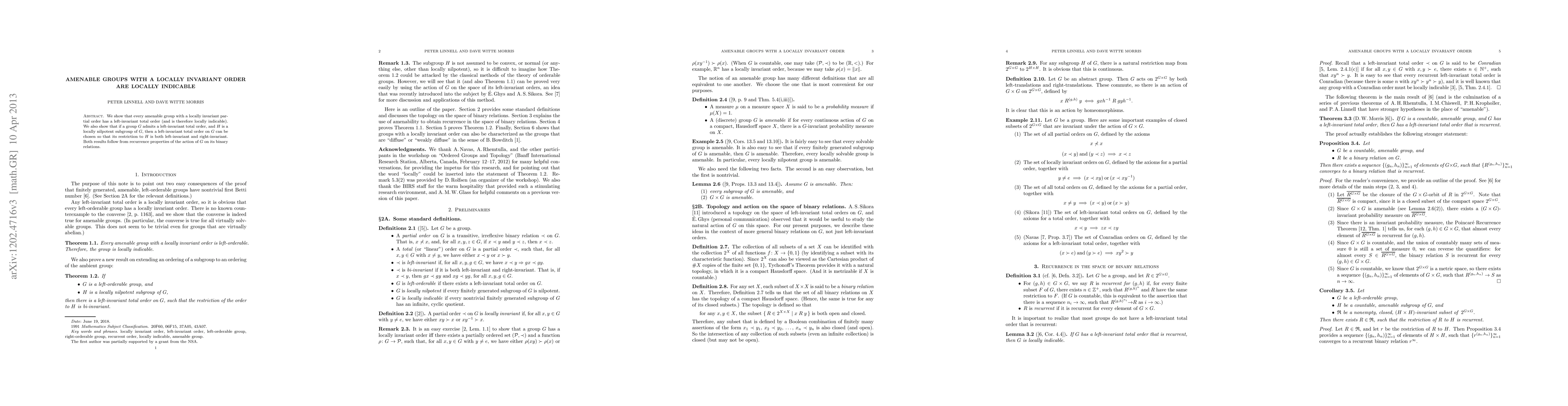 We show that every amenable group with a locally invariant partial order has a left-invariant total order (and is therefore locally indicable). We also show that if a group G admits a left-invariant total order, and H is a locally nilpotent subgroup of G, then a left-invariant total order on G can be chosen so that its restriction to H is both left-invariant and right-invariant. Both results follow from recurrence properties of the action of G on its binary relations.