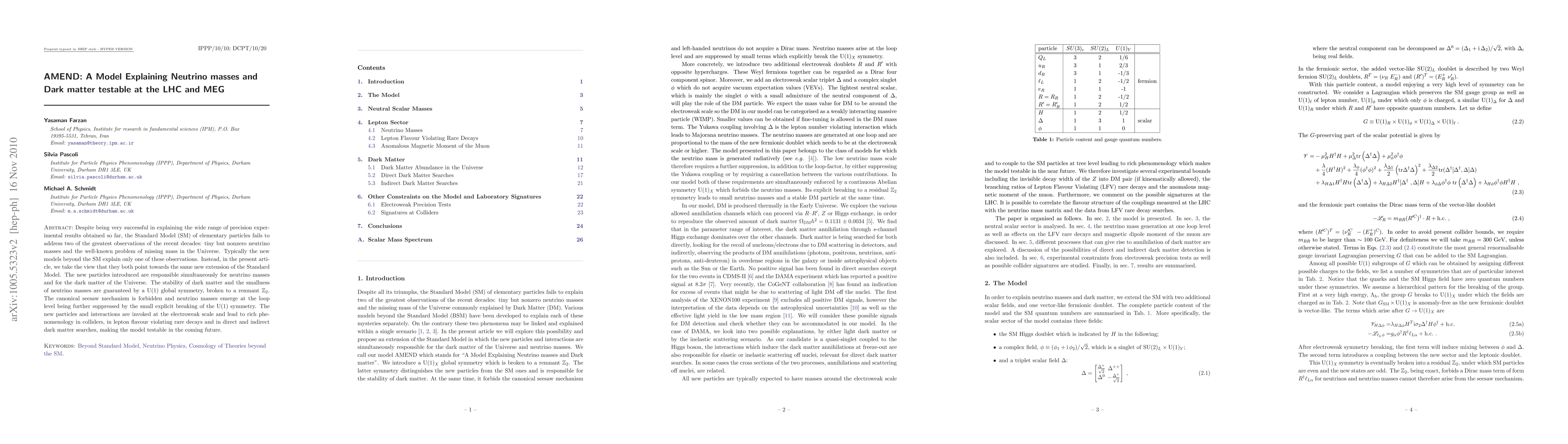 This paper proposes a new model, AMEND, that simultaneously explains both neutrino masses and dark matter, addressing two major gaps in the Standard Model. The model introduces new particles and interactions at the electroweak scale, offering testable predictions for LHC and MEG experiments, as well as for dark matter searches.