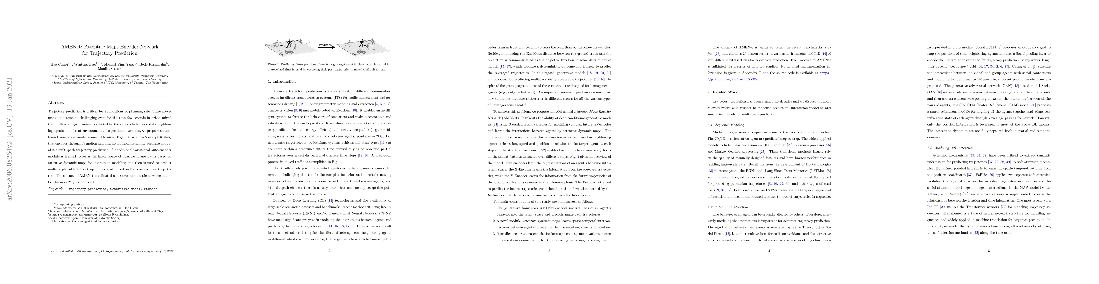 AMENet is an end-to-end generative model for accurate multi-path trajectory prediction in urban traffic, utilizing attentive dynamic maps and a conditional variational auto-encoder to model interactions and predict future movements. Its effectiveness is demonstrated through benchmarks on Trajnet and InD datasets.