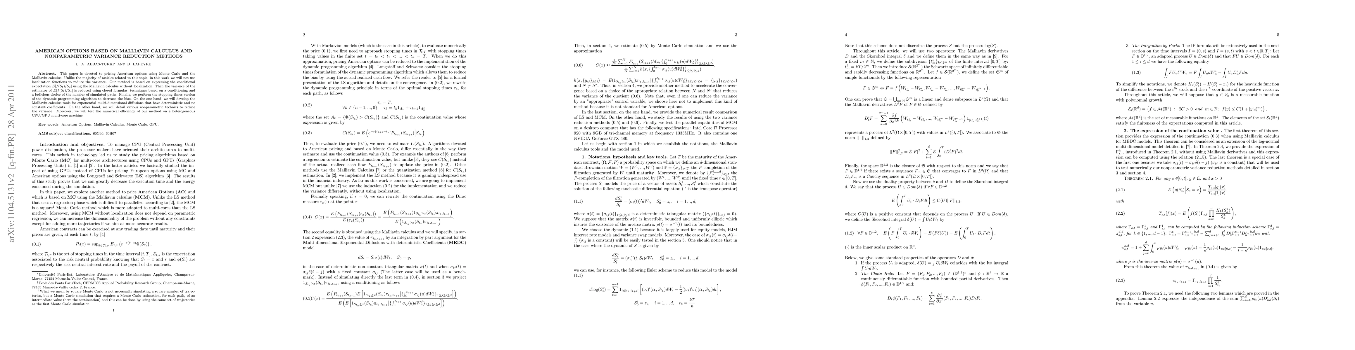 This paper proposes a novel method for pricing American options, utilizing Monte Carlo simulations and Malliavin calculus without localization functions. It reduces variance through closed formulas and dynamic programming, and tests the efficiency on a multi-core CPU/GPU system.