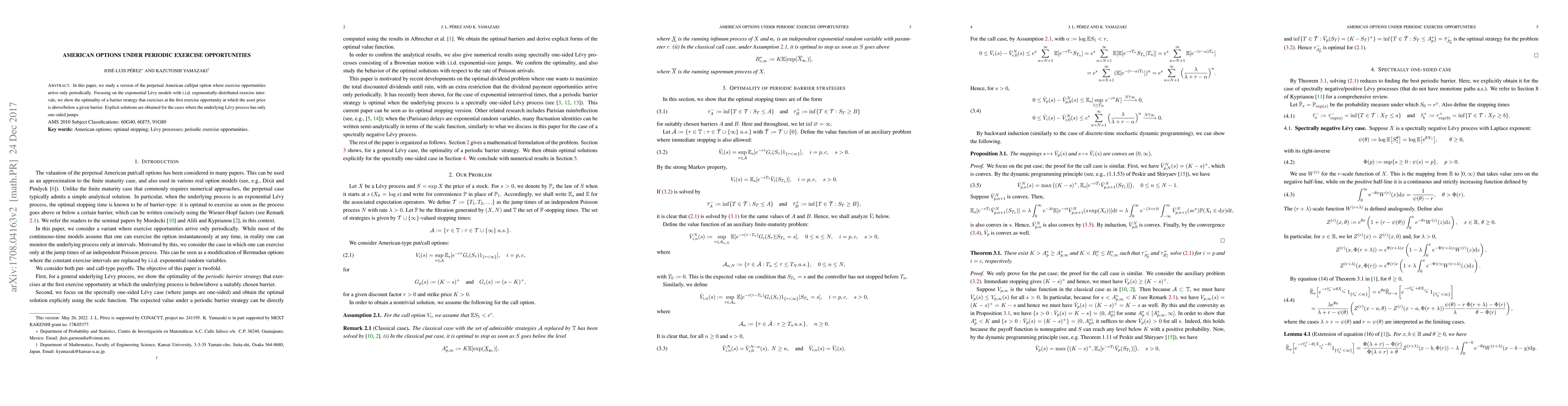 This paper investigates American options with periodic exercise opportunities using exponential Lévy models, demonstrating that a barrier strategy is optimal. Explicit solutions are derived for Lévy processes with one-sided jumps.