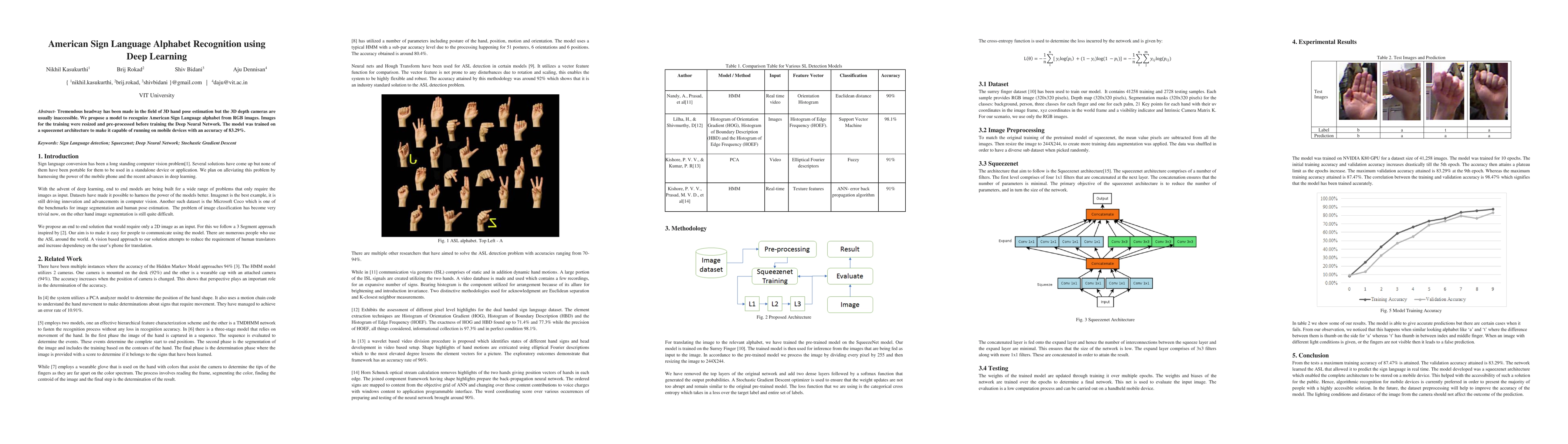 This paper proposes a deep learning model using a SqueezeNet architecture to recognize American Sign Language alphabet from RGB images, achieving 83.29% accuracy, aiming to provide an accessible alternative to 3D hand pose estimation without requiring depth cameras.
