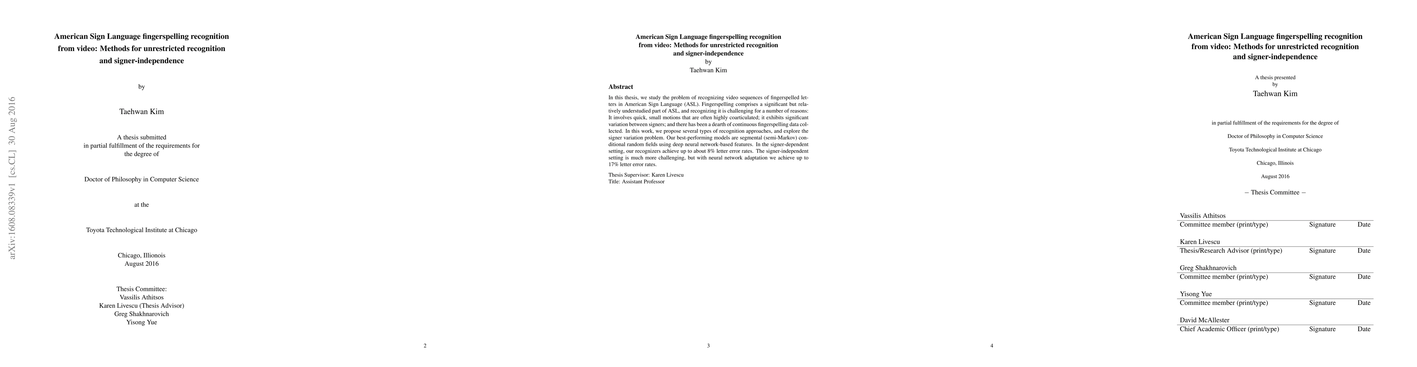 In this thesis, we study the problem of recognizing video sequences of fingerspelled letters in American Sign Language (ASL). Fingerspelling comprises a significant but relatively understudied part of ASL, and recognizing it is challenging for a number of reasons: It involves quick, small motions that are often highly coarticulated; it exhibits significant variation between signers; and there has been a dearth of continuous fingerspelling data collected. In this work, we propose several types of recognition approaches, and explore the signer variation problem. Our best-performing models are segmental (semi-Markov) conditional random fields using deep neural network-based features. In the signer-dependent setting, our recognizers achieve up to about 8% letter error rates. The signer-independent setting is much more challenging, but with neural network adaptation we achieve up to 17% letter error rates.
