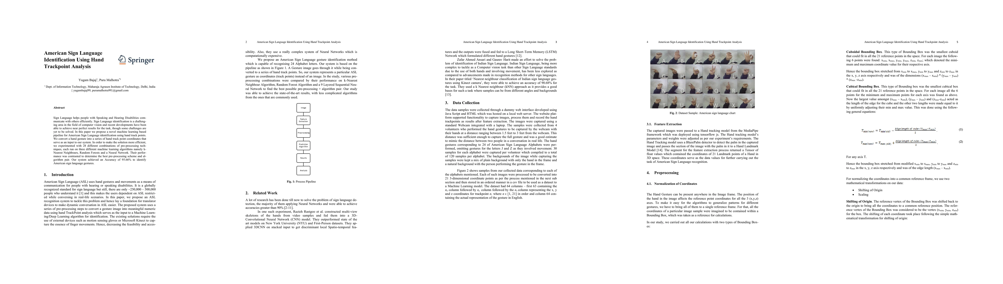 This paper proposes a machine learning-based pipeline for American Sign Language identification using hand trackpoint analysis, achieving an accuracy of 95.66%. The study explores various pre-processing techniques and machine learning algorithms to optimize the identification process.