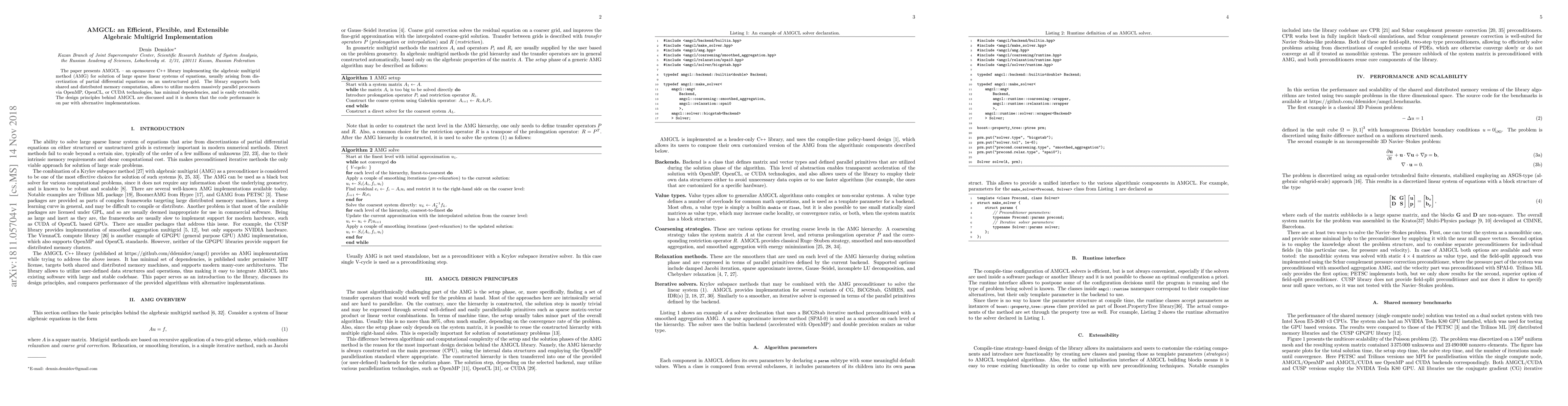 AMGCL is an open-source C++ library for solving large sparse linear systems using the algebraic multigrid method, supporting parallel computation via OpenMP, OpenCL, and CUDA. It demonstrates performance comparable to other implementations while being flexible and easily extensible.