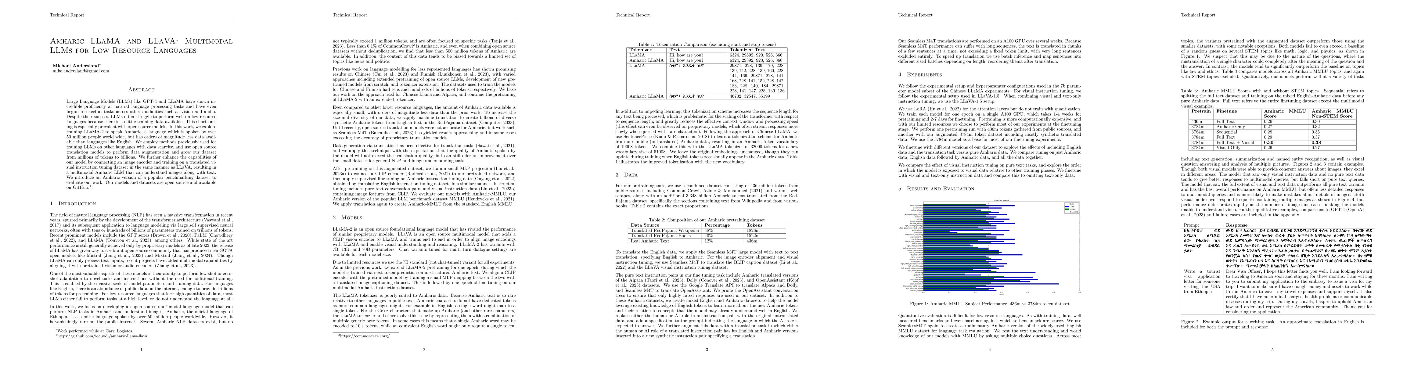 Large Language Models (LLMs) like GPT-4 and LLaMA have shown incredible proficiency at natural language processing tasks and have even begun to excel at tasks across other modalities such as vision and audio. Despite their success, LLMs often struggle to perform well on low-resource languages because there is so little training data available. This shortcoming is especially prevalent with open source models. In this work, we explore training LLaMA-2 to speak Amharic, a language which is spoken by over 50 million people world wide, but has orders of magnitude less data available than languages like English. We employ methods previously used for training LLMs on other languages with data scarcity, and use open source translation models to perform data augmentation and grow our dataset from millions of tokens to billions. We further enhance the capabilities of our model by connecting an image encoder and training on a translated visual instruction tuning dataset in the same manner as LLaVA, resulting in a multimodal Amharic LLM that can understand images along with text. We introduce an Amharic version of a popular benchmarking dataset to evaluate our work. Our models and dataset are open sourced and available on GitHub.