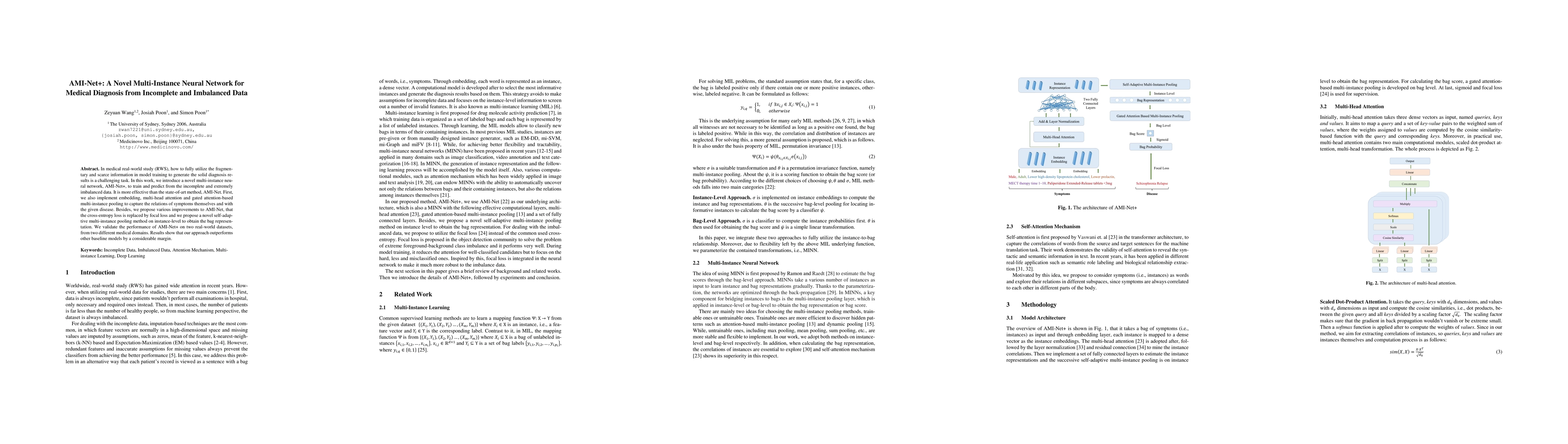 AMI-Net+ improves medical diagnosis performance using incomplete and imbalanced data with enhanced multi-instance pooling and loss functions.