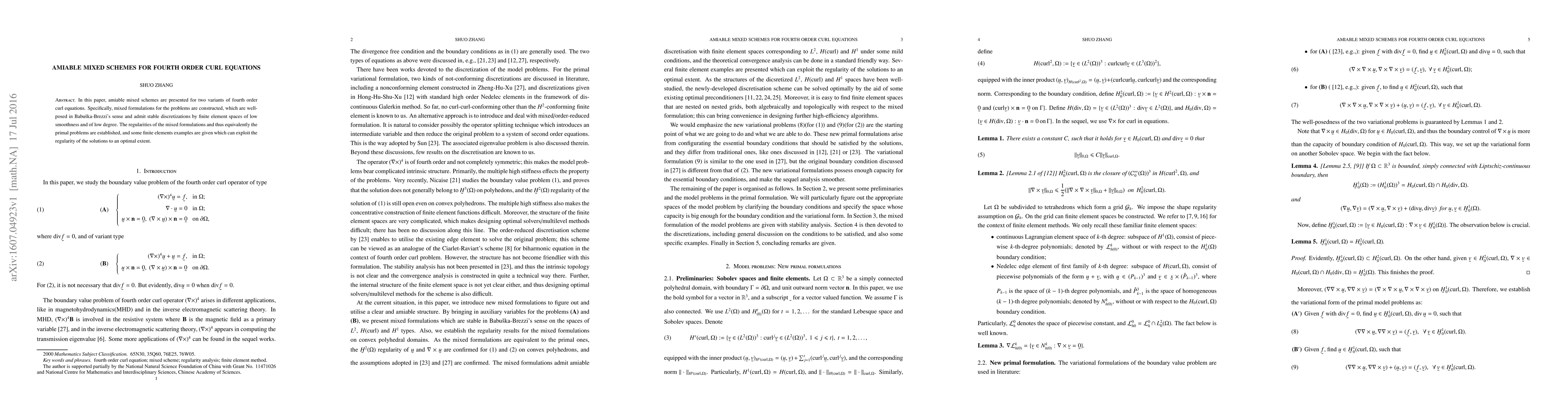 In this paper, amiable mixed schemes are presented for two variants of fourth order curl equations. Specifically, mixed formulations for the problems are constructed, which are well-posed in Babuska-Brezzi's sense and admit stable discretizations by finite element spaces of low smoothness and of low degree. The regularities of the mixed formulations and thus equivalently the primal problems are established, and some finite elements examples are given which can exploit the regularity of the solutions to an optimal extent.